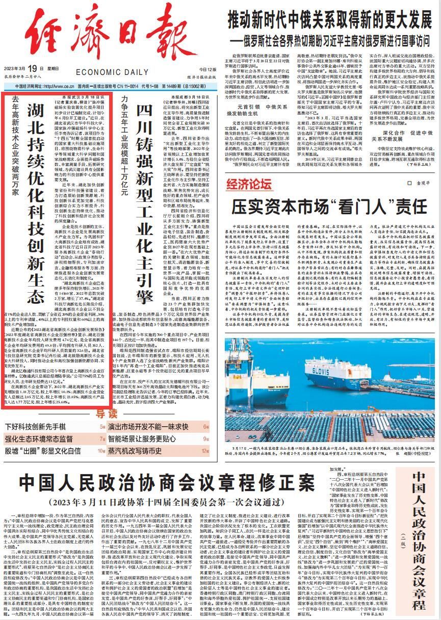 3月19日,《经济日报》头版头条刊文《去年高新技术企业突破两万家 湖北持续优化科技创新生态》,聚焦湖北省科技创新。