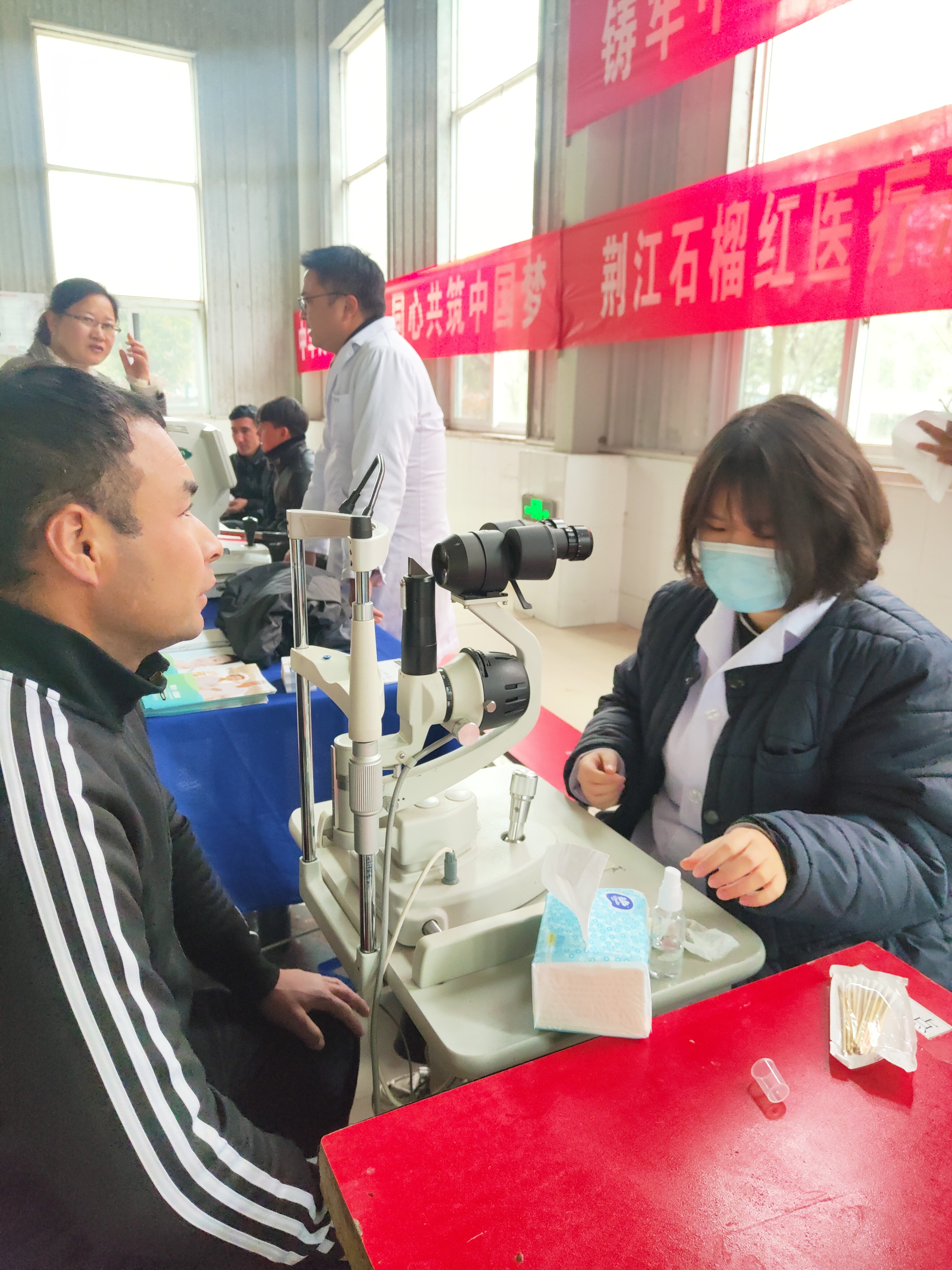 荆江石榴红医疗志愿服务队先后为老湾回族乡中心学校200多名师生和洪湖市威弘鞋业50多名员工进行义诊。义诊现场,学生们有序地排队进行视力检查,专家们用专业仪器为各族群众筛查白内障、青光眼、干眼症、散光等眼科疾病,并对需要治疗的群众详细讲解了治疗方法,治疗后的护理流程等。