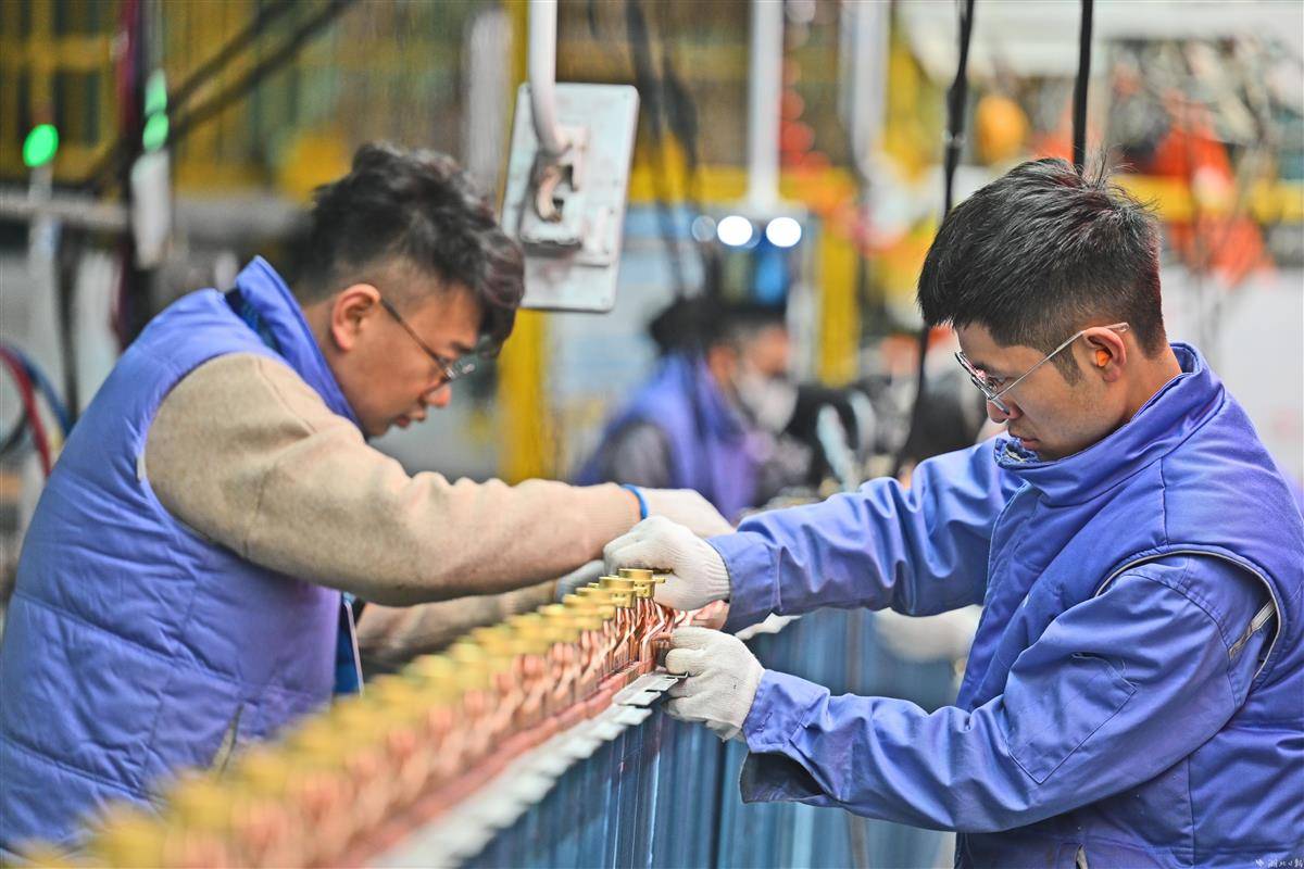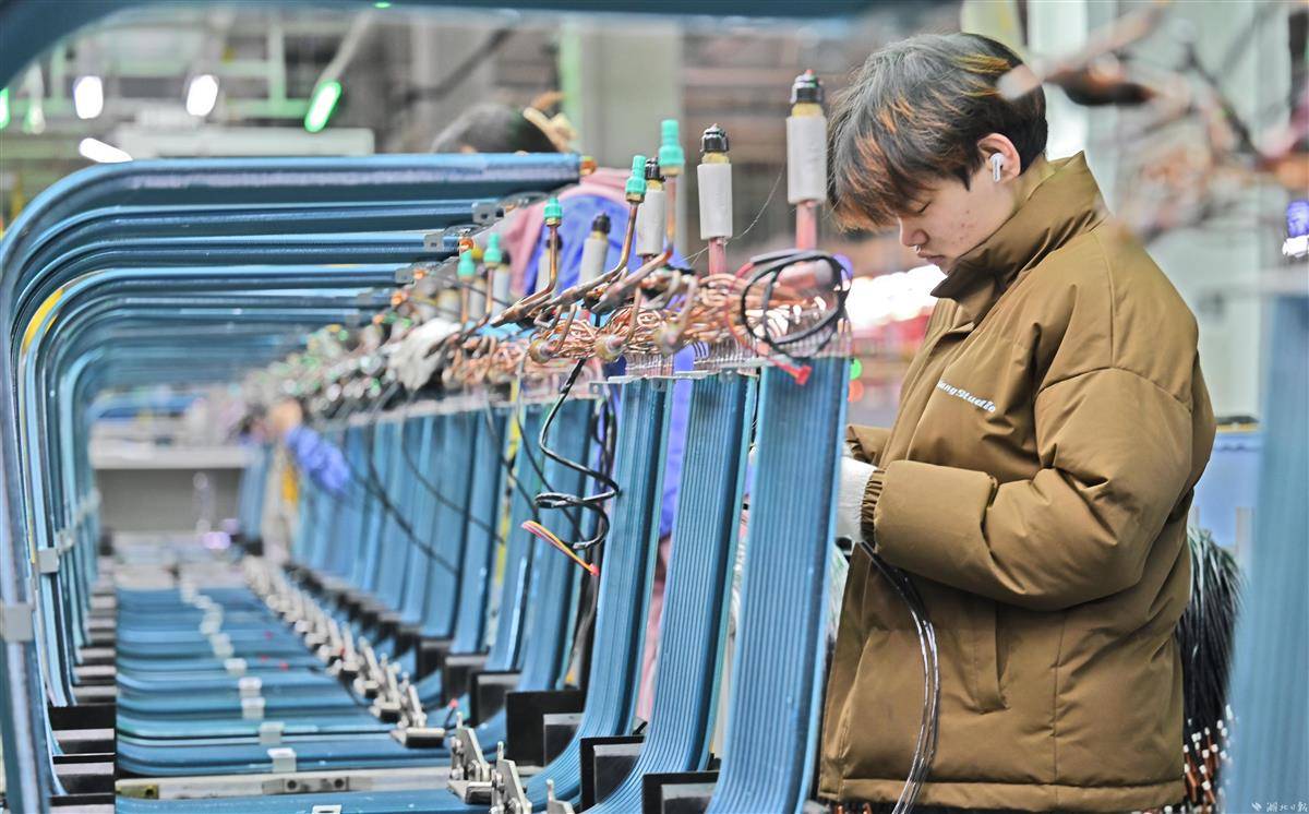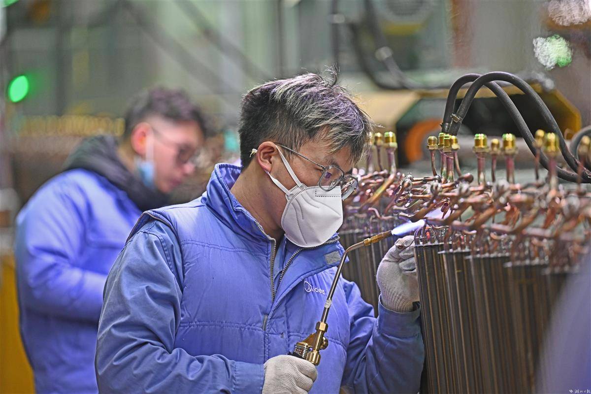 1月17日,荆州湖北美的楼宇科技有限公司生产线上,工人正在赶制空调内机。美的楼宇科技荆州产业园项目是美的楼宇科技事业部在国内继佛山、合肥、重庆后的第四大空调生产基地。自2023年以来,该公司立足数字化创新,实现了5G全连接,打造了数字产线和无人车间。新年伊始,开足马力,力争首月产量突破308000台。据了解,荆州市美的“空冰洗”吸引集聚配套企业124家,该市智能装备制造规模以上企业已经达到450家,总产值907.6亿元,目前正全力冲刺千亿产业的目标。
