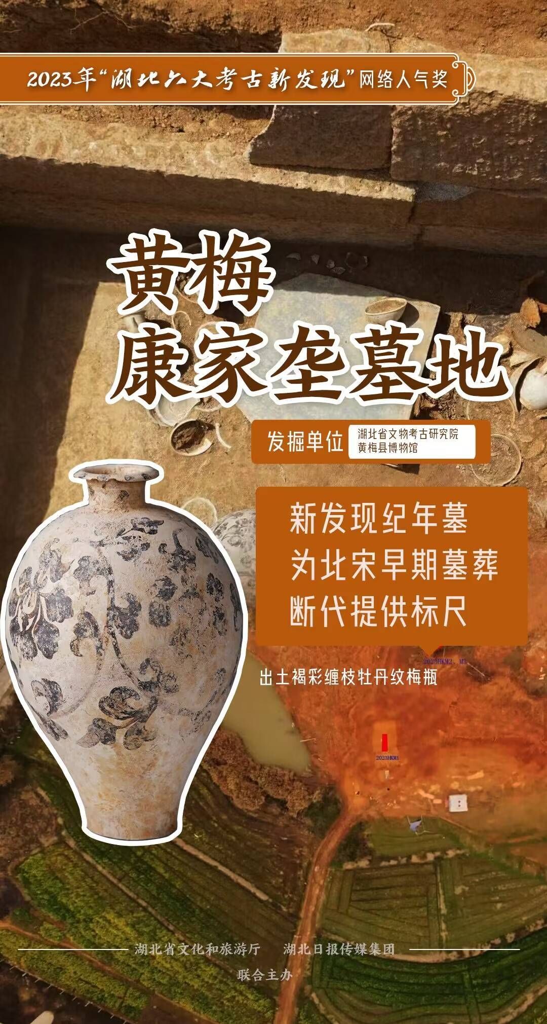 2023年“湖北六大考古新发现”评选推介活动,由湖北省文化和旅游厅联合湖北日报传媒集团主办。本次评选推介新增网络投票环节,吸引30余万网友关注、参与,黄梅县康家垄墓累计票数最高,被授予“网络人气奖”。