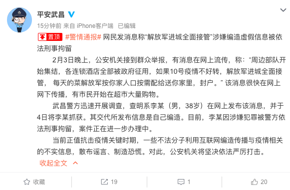 昨天深夜,武昌警方通报,一网民发消息称“解放军进城全面接管”涉嫌编造虚假信息被依法刑事拘留。