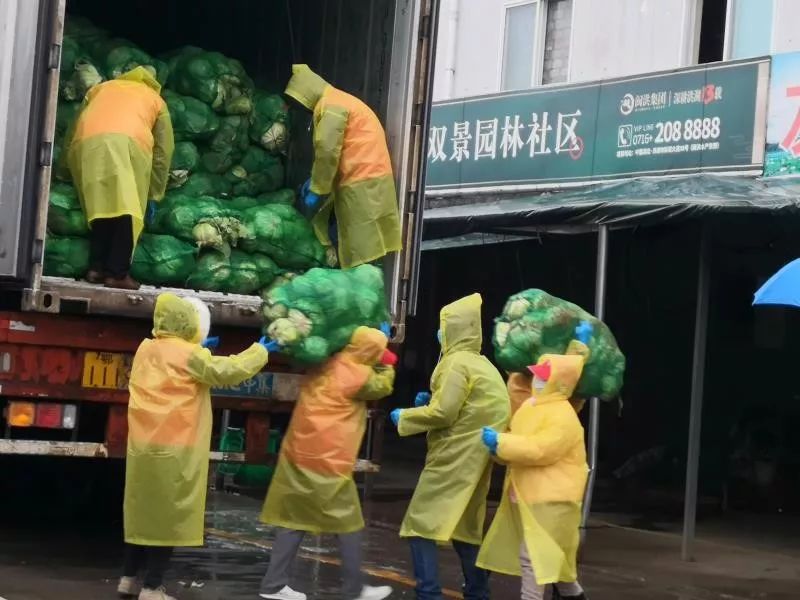 为支援我市抗疫一线,由广西省南宁市紧急调配的213吨果蔬、3.1万盒速食食品运抵洪湖后,60名志愿者顶风冒雨,加班加点,迅速转运分发至各抗疫一线。不少志愿者还积极帮助奋战在疫情防控斗争一线的医护人员和困难群众,义务配送生活物质,帮助解决实际困难、排除后顾之忧。