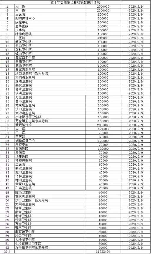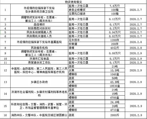 自新型冠状病毒感染的肺炎疫情发生以来,社会各界纷纷伸出援助之手,捐款捐物,为我市疫情防控工作提供了大力援助,体现了社会大爱和守望相助的精神。现将洪湖市接受捐赠及使用情况公示如下(2020.2.7—2020.2.10):