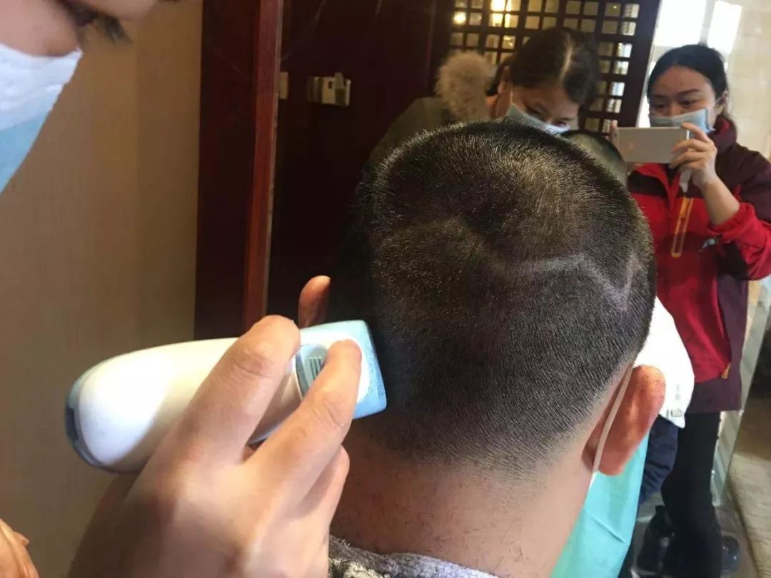2月12日晚,广东医疗队的队员们在驻地进行战前准备,剪头发、穿脱防护服成为训练的必修课。马上就要上战场了,大家斗志满满。他们认真练习穿脱防护服,力争把防护做到最好,做到零感染。南方医院党委书记朱宏一边检查一边叮嘱大家,一定要做好自我防护,才能保护更多的人,才能打赢这场防疫阻击战。为更好地投入战斗,队员们自觉剪短了头发,方便穿戴防护服。一位队员将自己的头发剃成一个爱心和心电图的形状,他说,希望大家积极乐观地面对战斗。