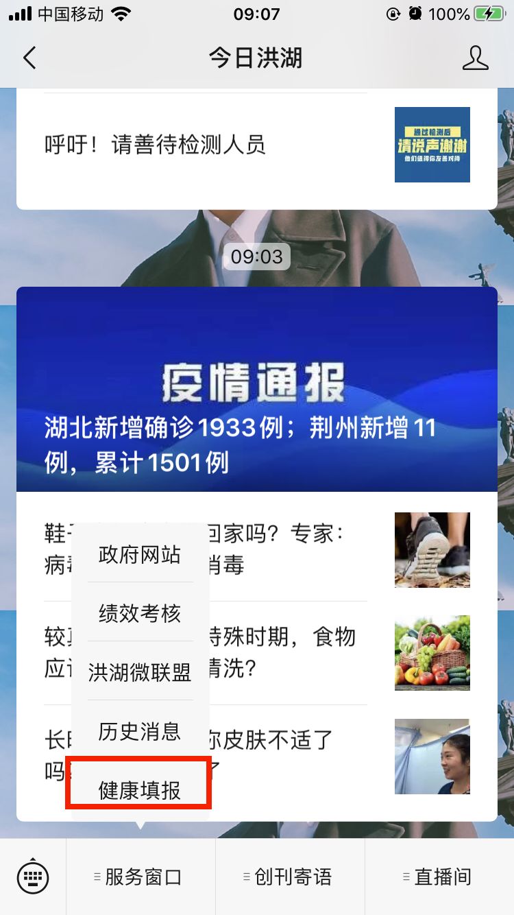 2、点开“今日洪湖”菜单栏,进入服务窗口-健康填报,按提示操作。
