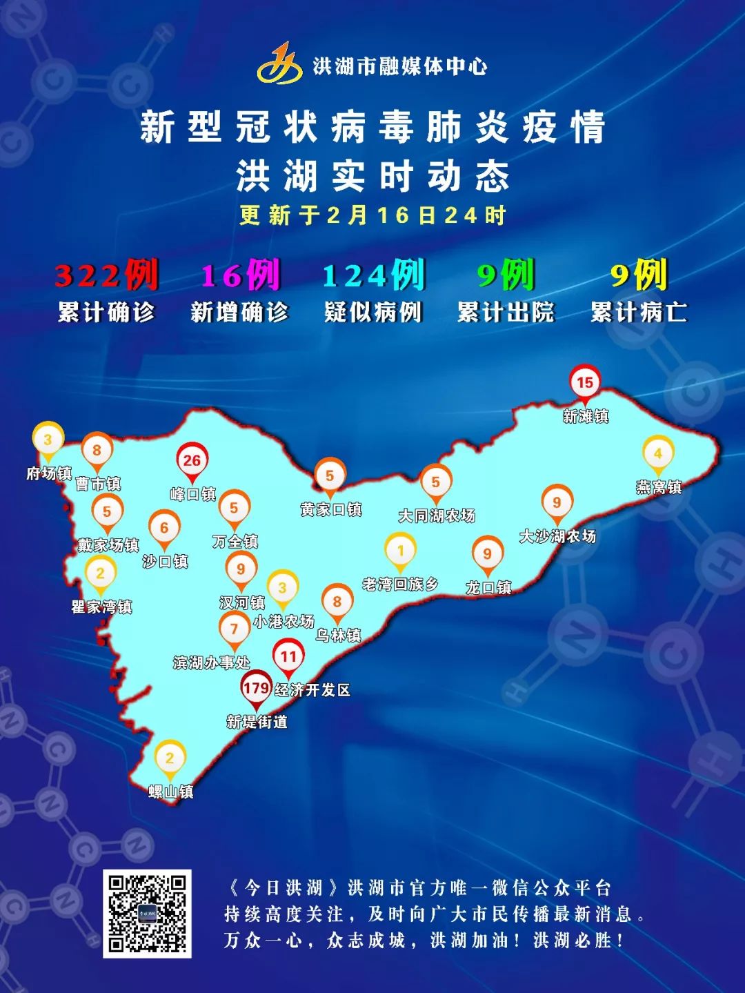 截至2020年2月16日24时,我市新增新型冠状病毒感染肺炎确诊病例16例,累计报告确诊病例322例(含转诊荆州10例,累计死亡8例);临床诊断病例3例(含死亡1例);疑似病例124例;新增出院确诊病人3例,累计出院9例。