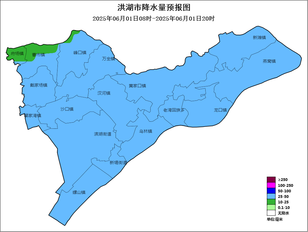 △洪湖市6月1日08时至20时降雨量预报图