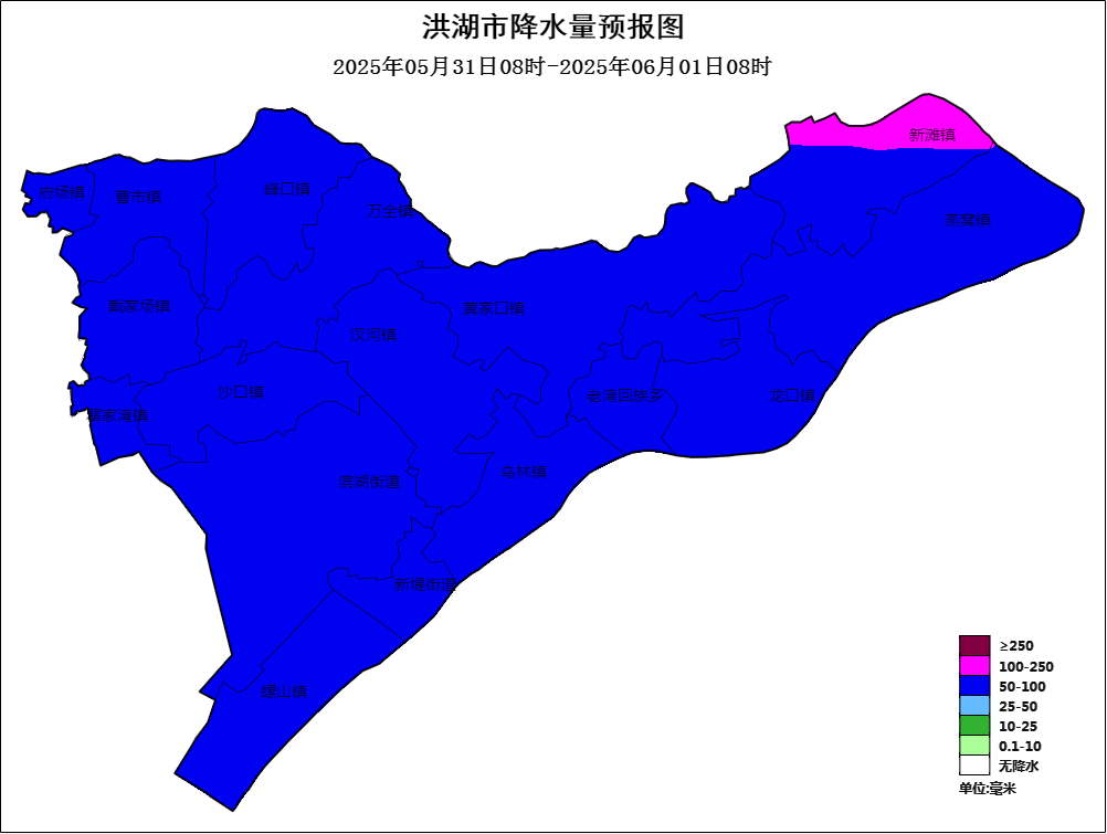 △洪湖市5月31日08时至6月1日08时降雨量预报图