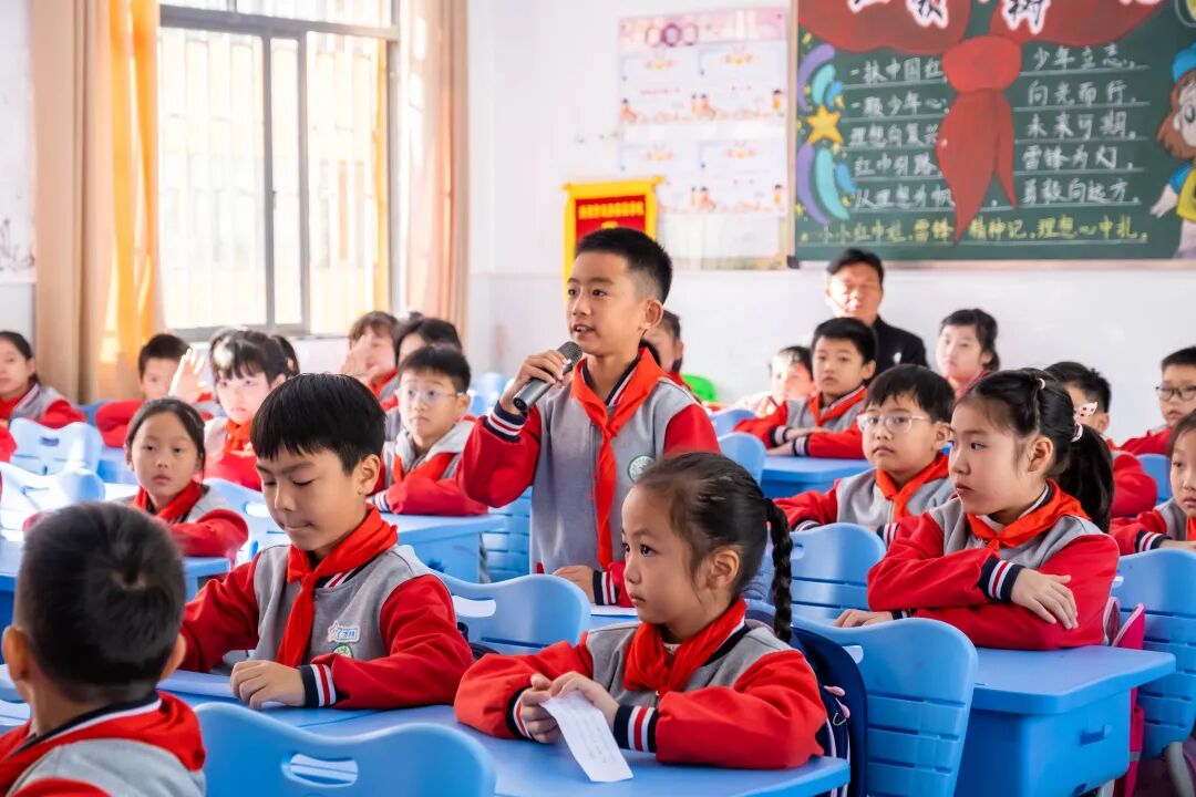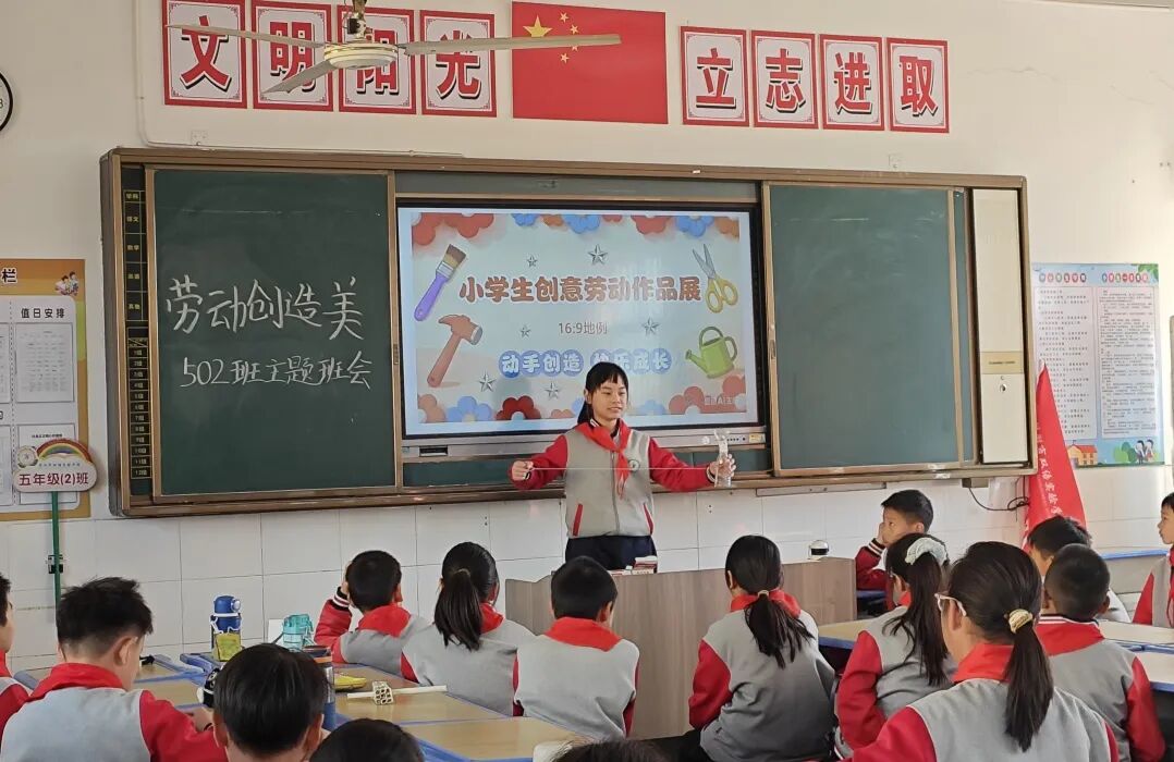 随后,与会人员分组走进不同学段的主题班队会课堂:在1—2年级“文明礼仪伴我行”班会上,孩子们唱着文明礼仪歌,在歌声中学习校园礼仪的点点滴滴;在3—4年级“雷锋精神代代传”队会中,师生分享“帮邻居奶奶取快递”“拾金不昧”的身边故事,手绘的雷锋漫画贴满了教室窗框与后墙;在5—6年级“劳动创造美”课堂上,“小学生创意劳动作品展”格外吸睛。学生们手持自制的小蓝鲸风向标演示风向原理,拾取公园秋日的落叶制成魔法帽子,简单的纸盒和塑料瓶在一双双巧手下变成了演绎动能的奇思妙物,“劳动最光荣”的理念就这样在动手实践中住进了童心。