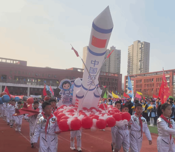 开幕式现场,气氛热烈而庄重。当师生们围绕科技主题进行的创意方阵出场时,全场观众的目光瞬间被吸引。有的方阵以浩瀚星空为主题,同学们头戴自制的星空帽,手持道具,仿佛在探索神秘的太空世界;有的方阵以中国天宫空间站为灵感,身着白色宇航服,迈着坚定的步伐,展现了中国航天的宏伟气势;还有的方阵以“神舟系列飞船”为元素,手持精心制作的各类航天器、火箭等手工品,展示了中国科技的强大实力。这些创意方阵不仅展示了同学们的创造力和想象力,也让大家感受到了科技的魅力。