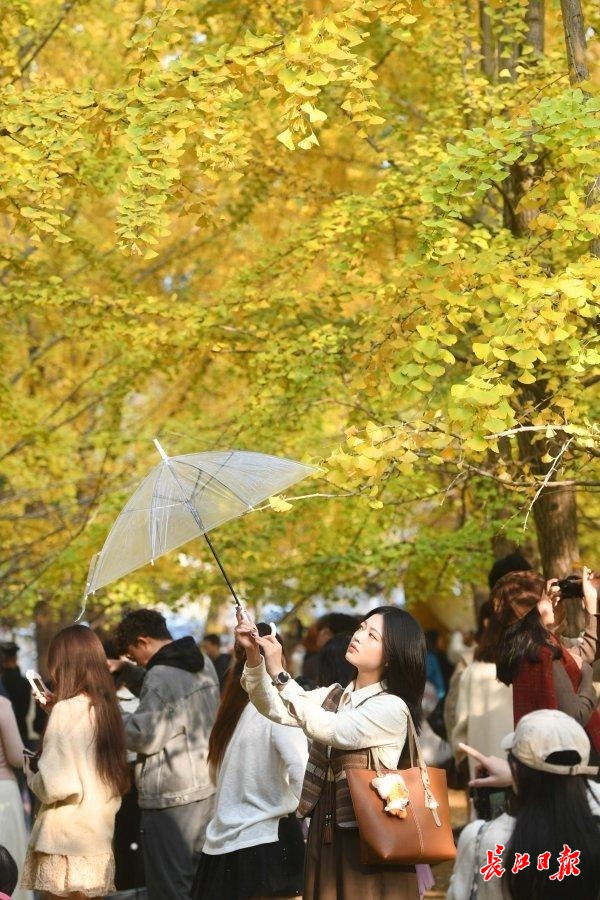 华科大银杏迎来最佳观赏期,不少学子驻足拍照。记者高勇 摄