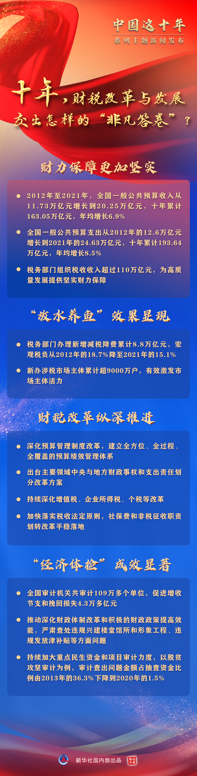 深化预算管理制度改革,建立全方位、全过程、全覆盖的预算绩效管理体系;出台主要领域中央与地方财政事权和支出责任划分改革方案;持续深化增值税和企业所得税改革,初步建立综合与分类相结合的个人所得税制度;强化财会监督,严格财经纪律……十年来,财税体制改革纵深推进。