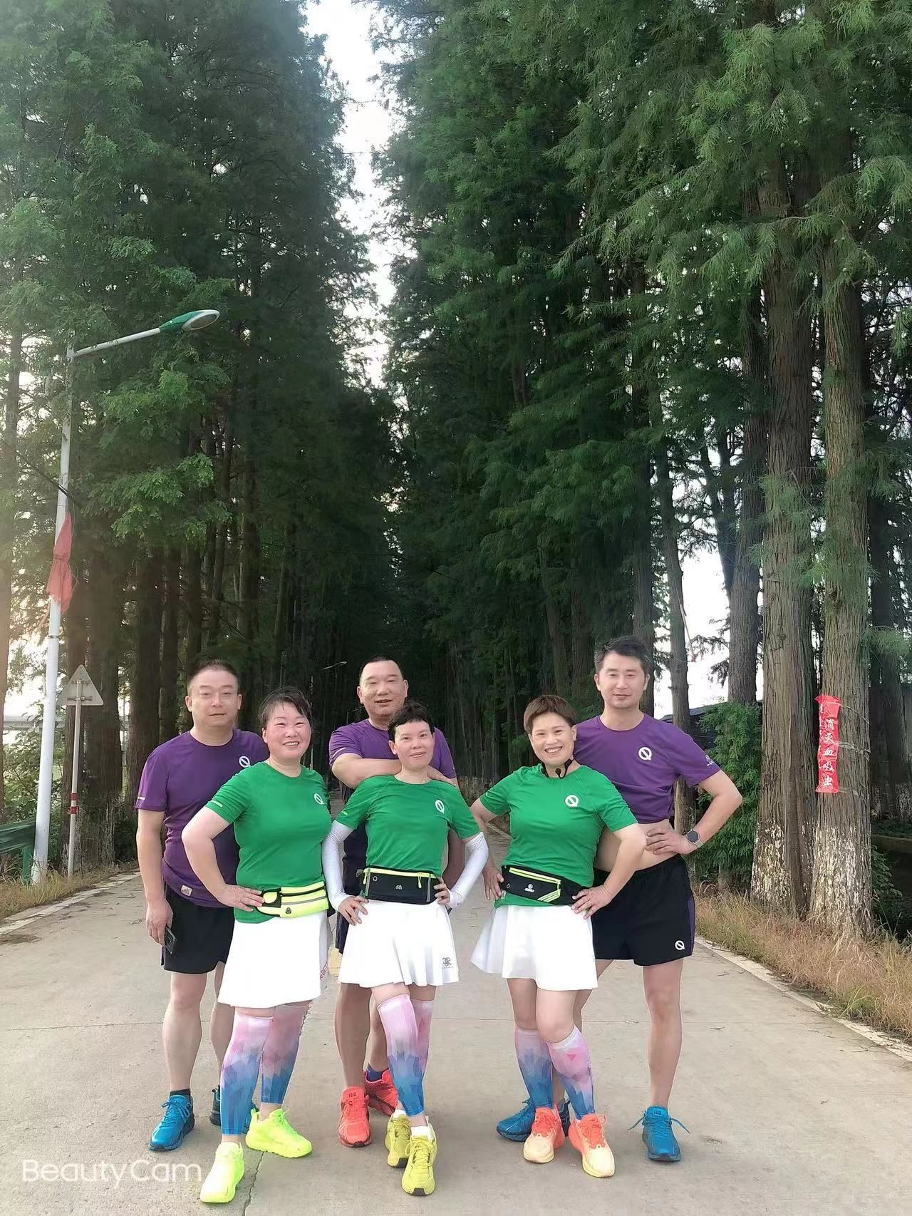 跑步不仅改变了我,也改变了老公。记得有一天,吴长让夫妇有事不能一同晨跑了,一个人跑索然无味,我便没有去晨跑。老公问起,我说:“没伴,看见她们都是夫妻一起跑好羡慕。我也想你陪着一起跑。”刚开始,他有点不愿意,然后说跑不动太累了。第二天早上他开始慢走,看我跑前面离他太远了,他也开始跑起来了,但跑不到一百米就气喘吁吁。接连几天他一点点的增加,从三百米到五百米,一公里到二公里现在可以跑三公里多了。这次我们庐山之行他也参加了晨跑。每次追风跑团的例跑和约跑活动他开始积极参与。有时还把自己跑的公里数偷偷地在群里晒晒,明显比以前更阳光自信了,我知道,这都是因为跑步带来的变化。