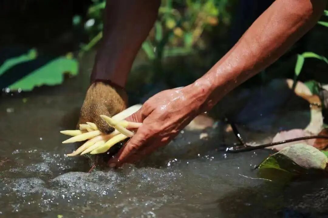 藕带采收已接近尾声,在黄家口镇新永林村,藕农们下到水齐腰深的藕田,将一条条沾满泥浆的藕带从水下缓缓抽出,简单清洗过后,嫩白的藕带显露出来。