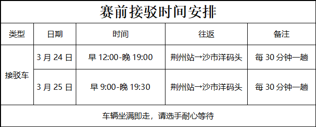 接驳时间:3月24日,3月25日提供荆州站至沙市洋码头的接驳车服务