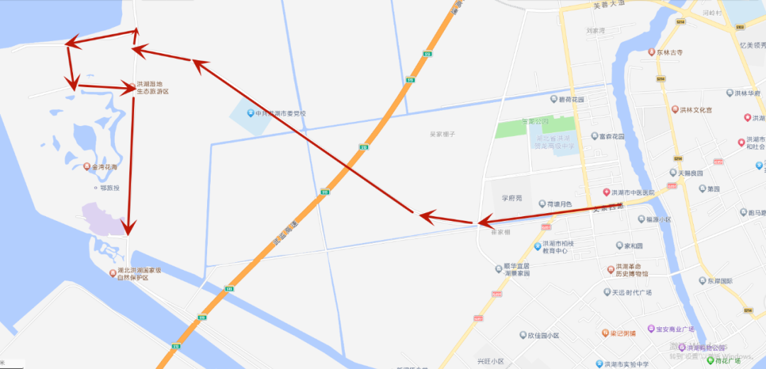 洪湖湿地公园、金湾酒店等地