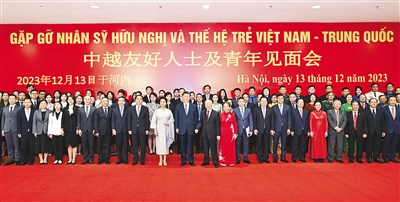 当地时间12月13日下午,中共中央总书记、国家主席习近平和夫人彭丽媛在河内同越共中央总书记阮富仲夫妇共同会见中越两国青年和友好人士代表。