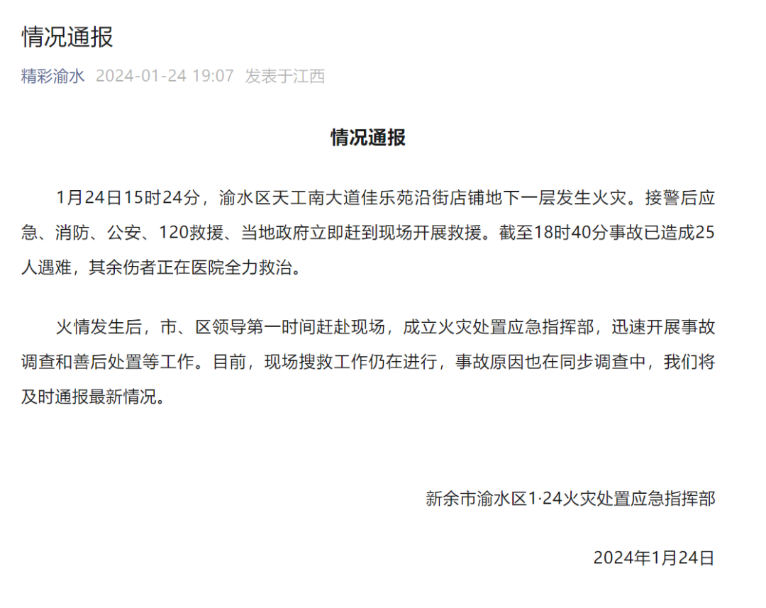 1月24日15时24分,江西省新余市渝水区天工南大道佳乐苑沿街店铺地下一层发生火灾。接警后应急、消防、公安、120救援、当地政府立即赶到现场开展救援。截至18时40分事故已造成25人遇难,其余伤者正在医院全力救治。