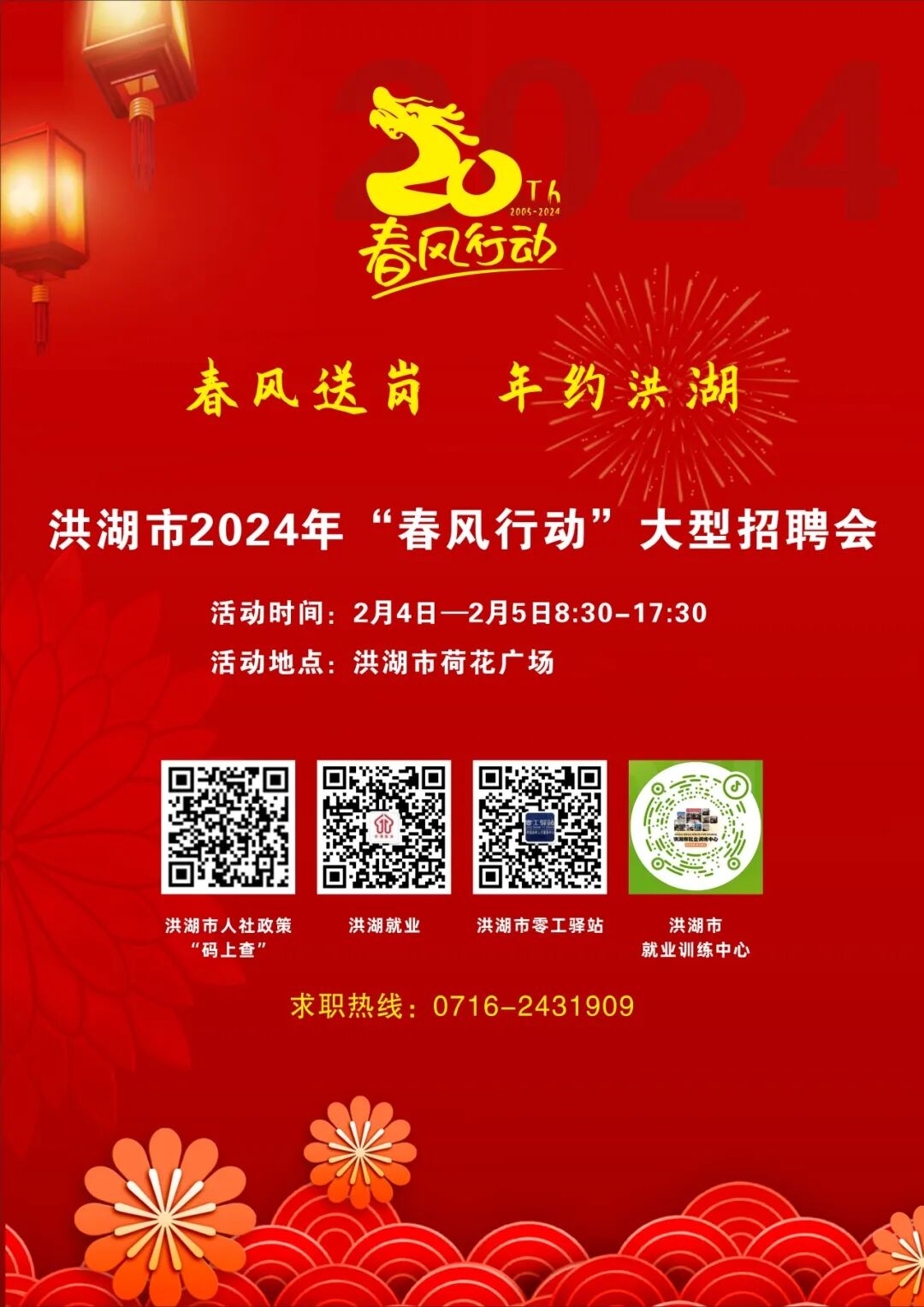 为服务全市企业招工用工、服务劳动者求职就业,洪湖市人力资源和社会保障局将于2024年2月4日、5日在洪湖市荷花广场与商务、农业农村、文旅等部门联合举办2024年“春风行动”大型招聘会暨第二届民俗年货赶集会。