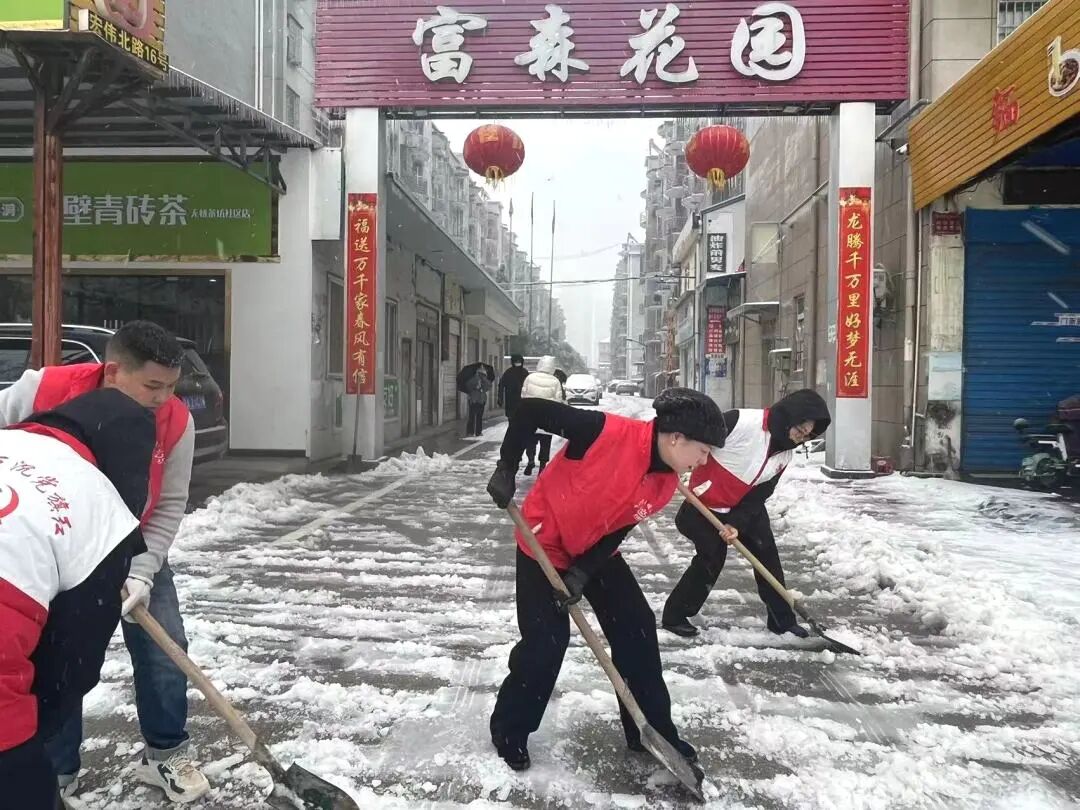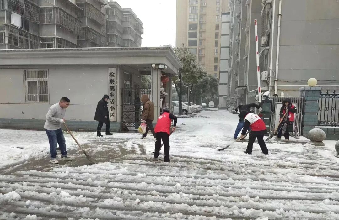 洪湖市检察院各部门干警迅速响应,大家克服出行困难,第一时间到达幸福河社区的天地鸿苑、富森花园等包保社区,立即开始扫雪除冰行动。