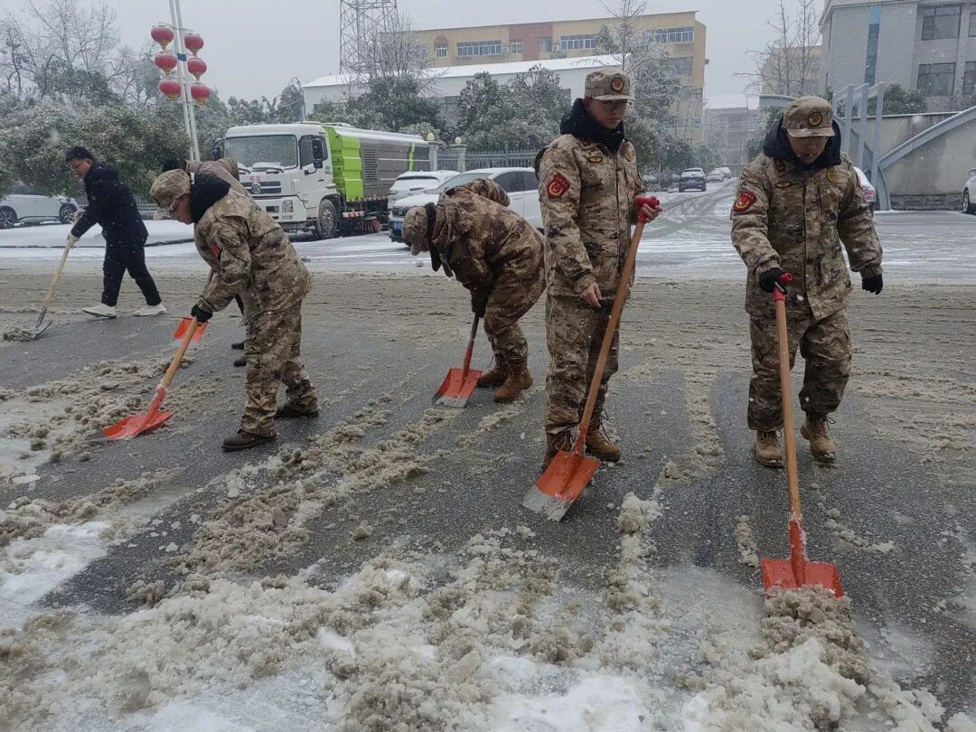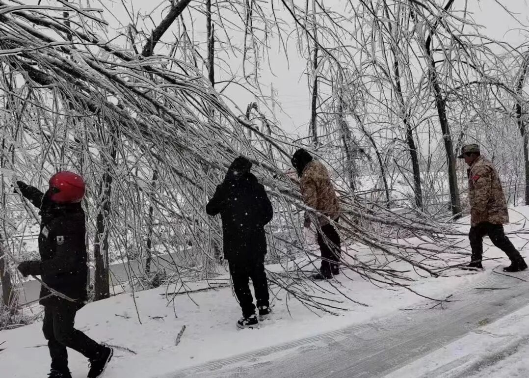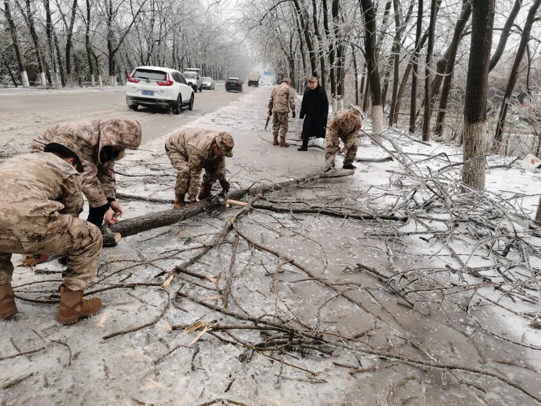 ▲洪湖市人武部组织基干民兵清理冰雪路障、树枝、排查冻雨天道路障碍隐患