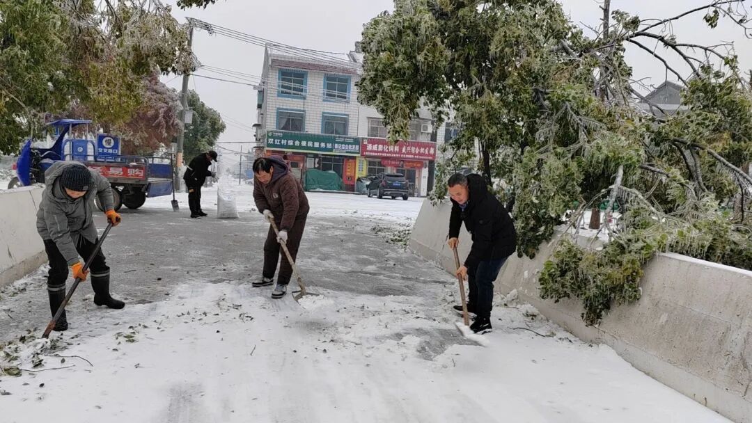 ▲乌林镇组织工作人员对路障、冰雪进行清理