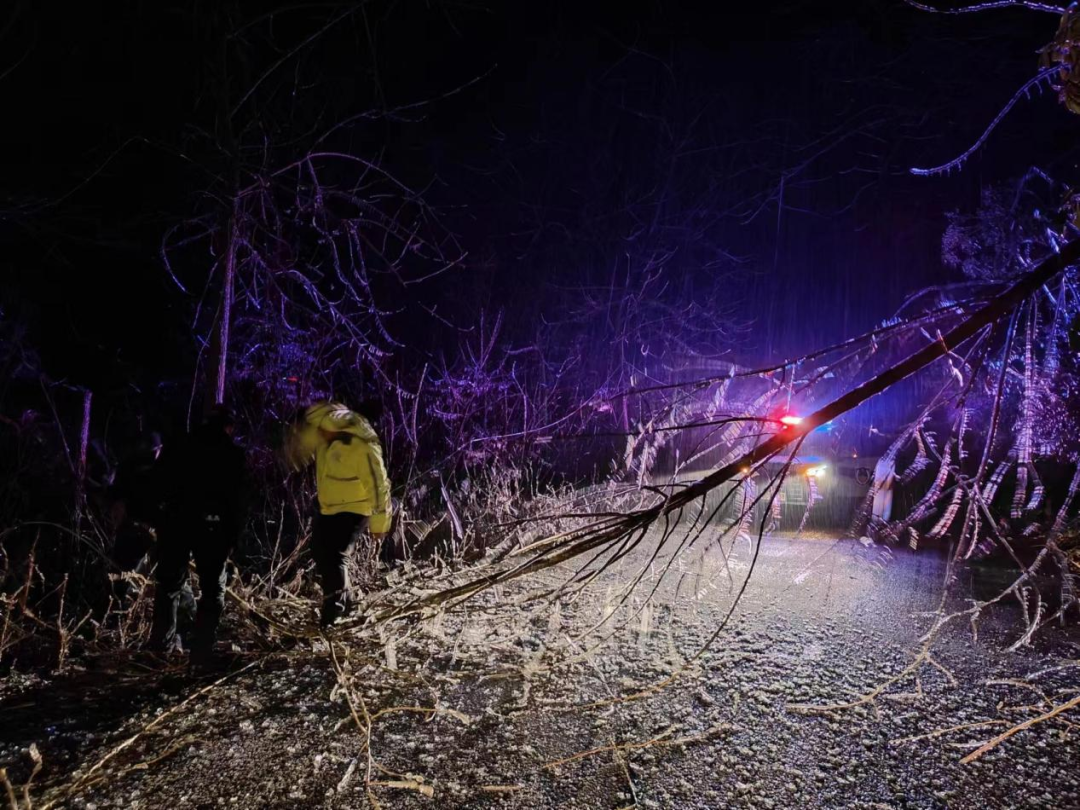 ▲2月4日,沙口镇组织党员干部开展清雪行动,撒融雪剂、清雪、机械清理断树