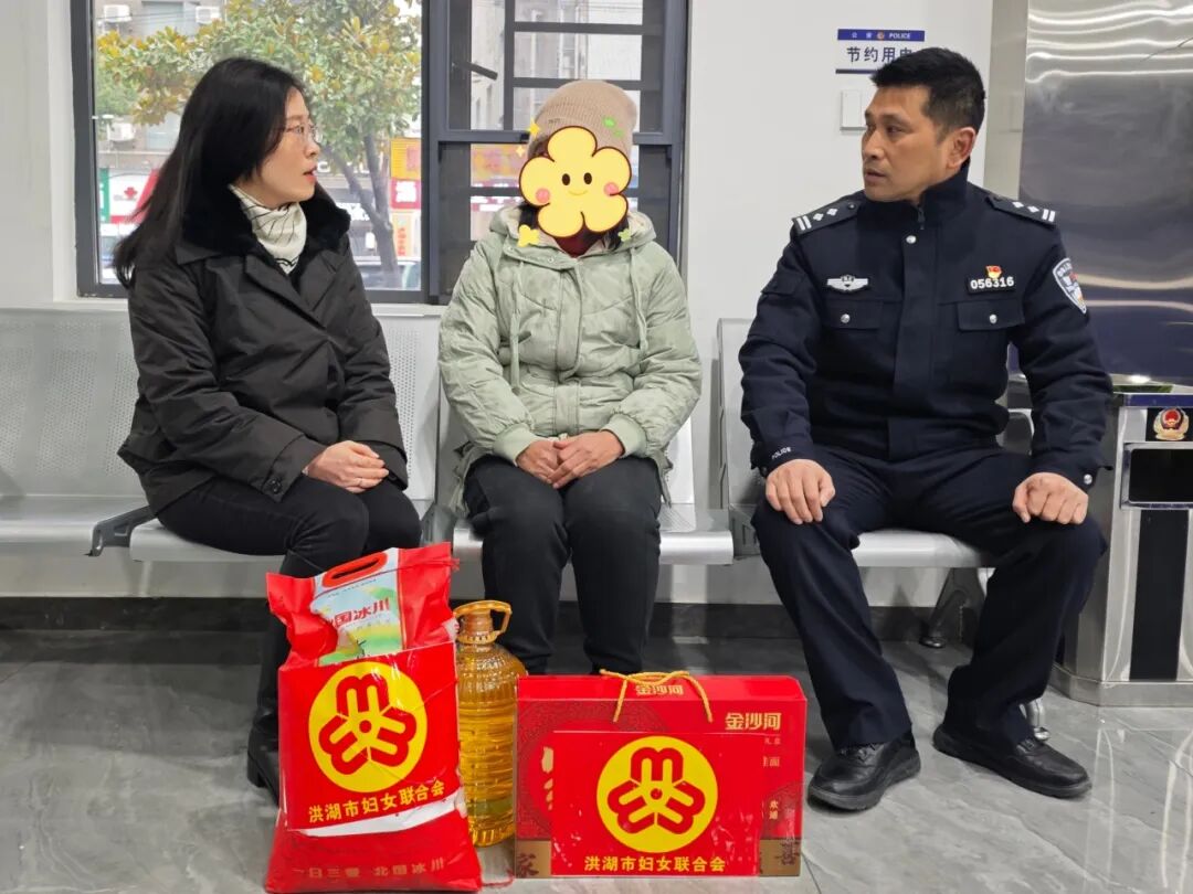 市妇联联合新堤派出所,慰问受家暴困难妇女,询问她的家庭生活现状和孩子的学习情况,鼓励她们积极面对生活,为她送上慰问物资和新春的问候。