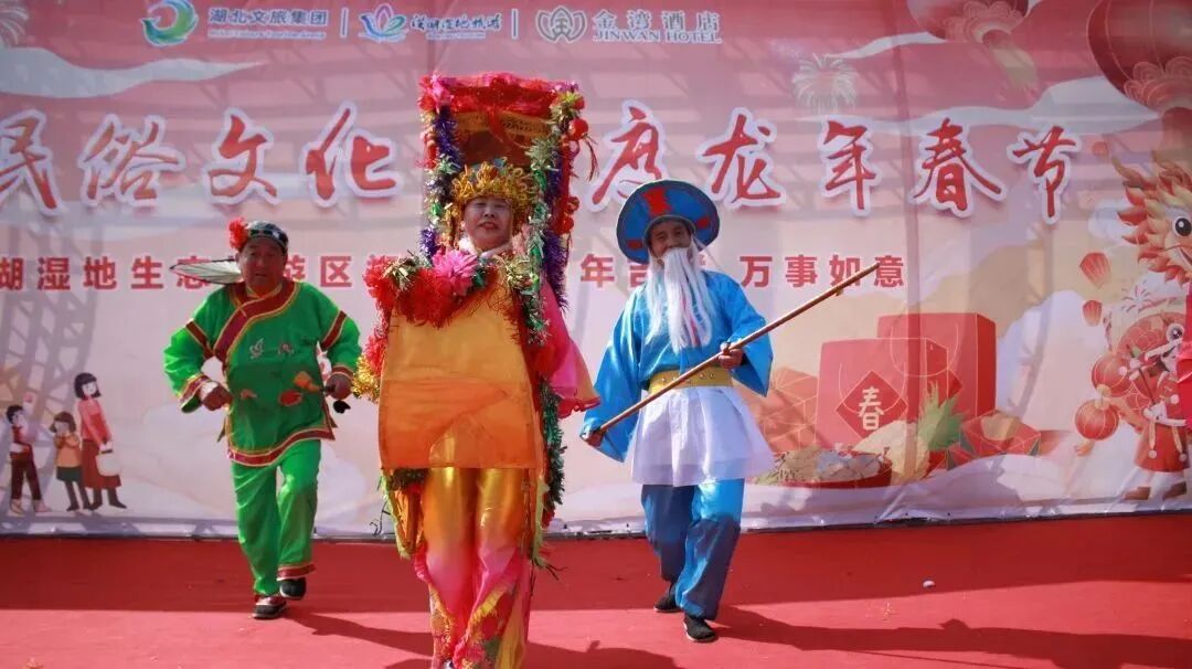 在洪湖龙街悬挂具有民俗特色的元宵彩灯,在彩灯下悬挂灯谜卡片,增加趣味性和可玩性;组织开展民俗文化和荆州花鼓戏节目展演。