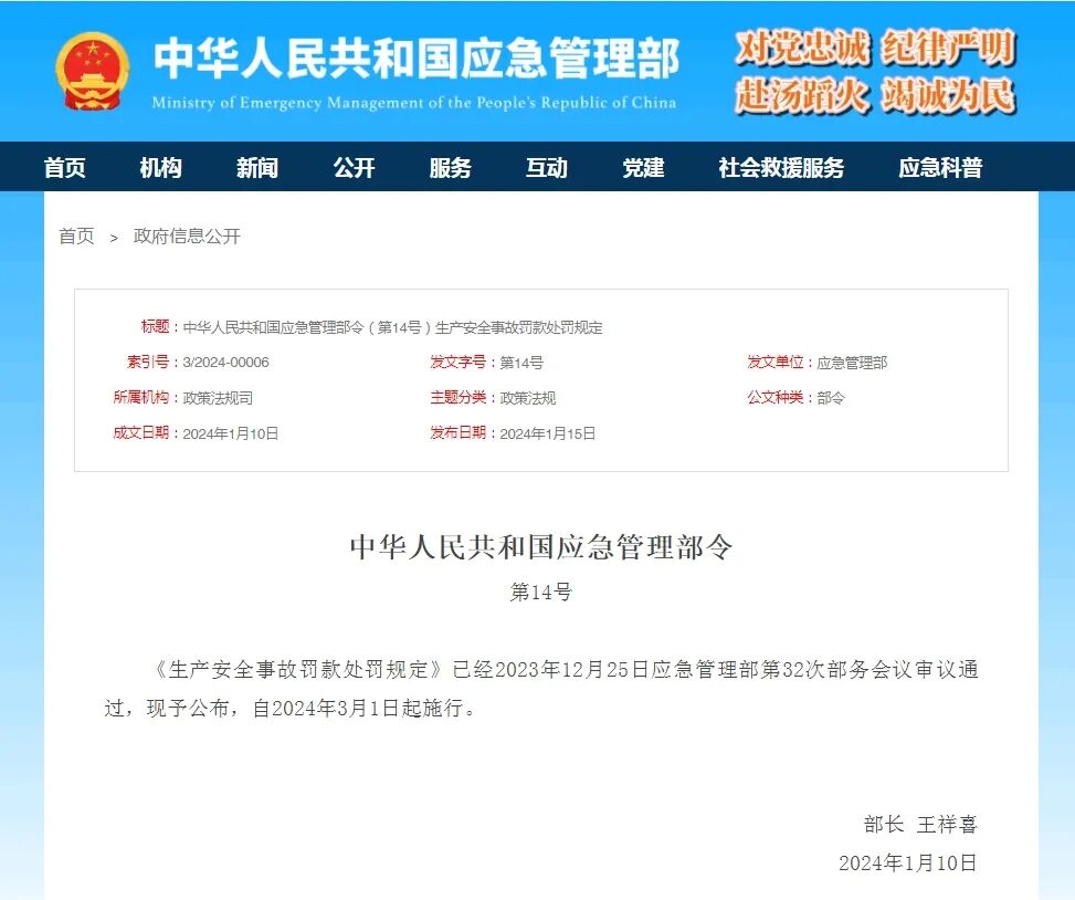 《生产安全事故罚款处罚规定》已经2023年12月25日应急管理部第32次部务会议审议通过,现予公布,自2024年3月1日起施行。