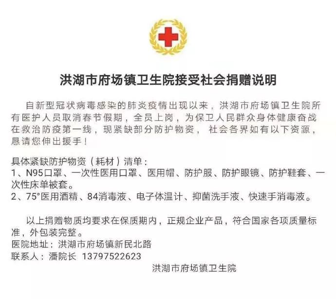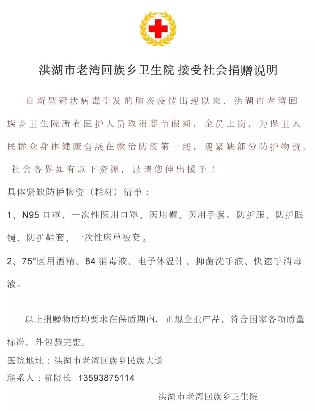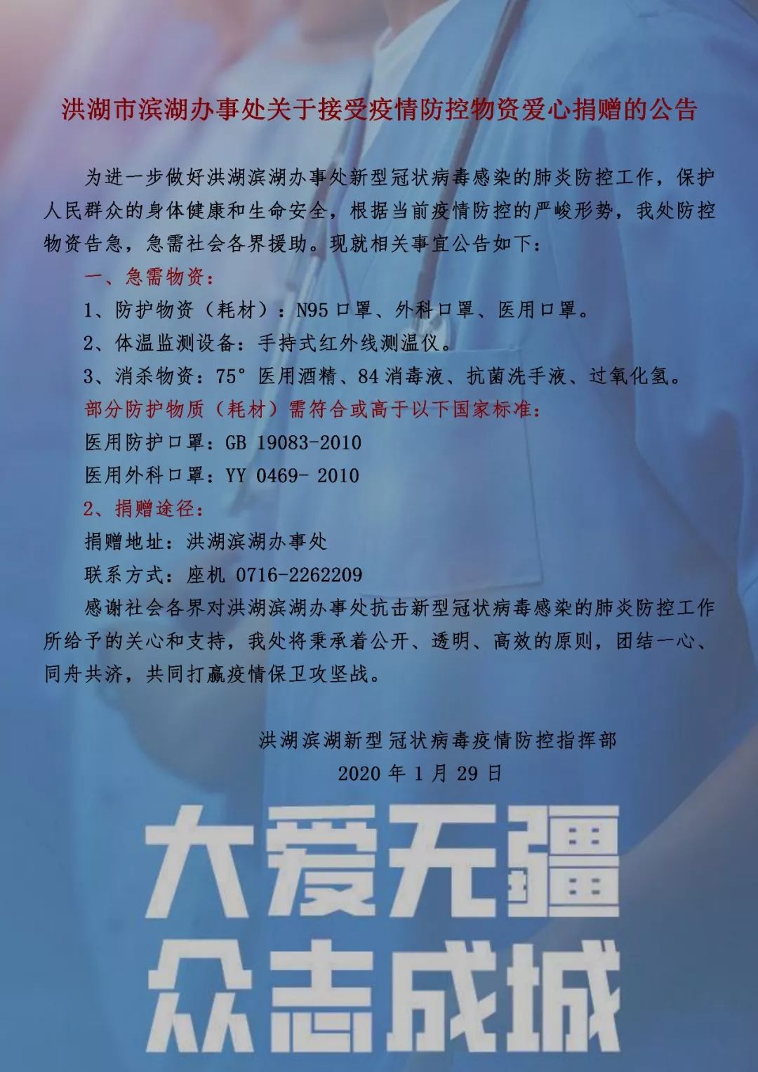 为进一步做好洪湖市燕窝镇新型冠状病毒感染的肺炎防控工作,保护人民群众的身体健康和生命安全,根据当前疫情防控的严峻形势,我镇防控物资告急,急需社会各界援助。现就相关事宜公告如下: