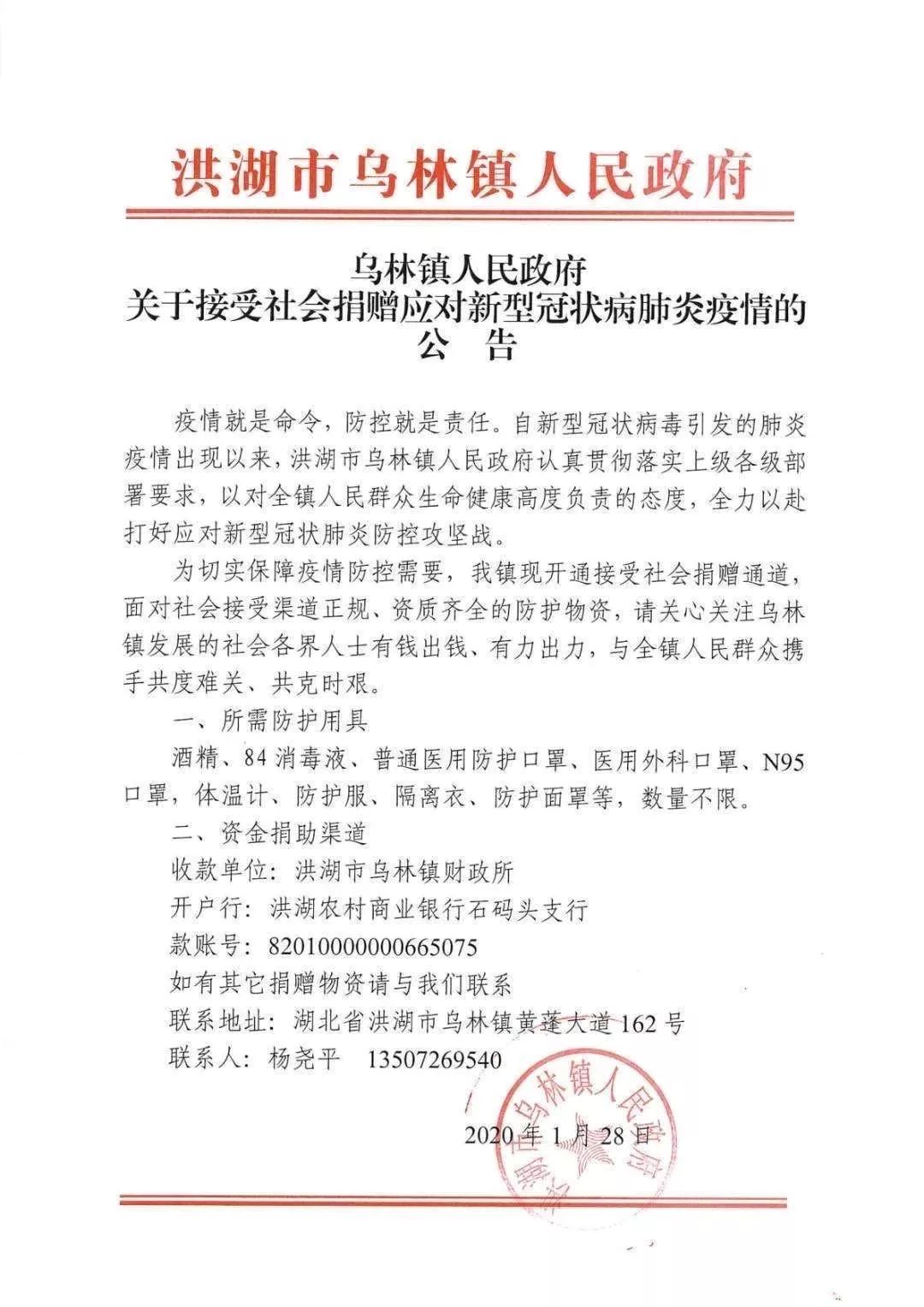 为进一步做好洪湖市万全镇新型冠状病毒感染的肺炎防控工作,保护人民群众的身体健康和生命安全,根据当前疫情防控的严峻形势,我镇防控物资紧缺,急需援助,请关心关注万全镇发展的社会各界人士积极支持,与全镇人民共渡难关。