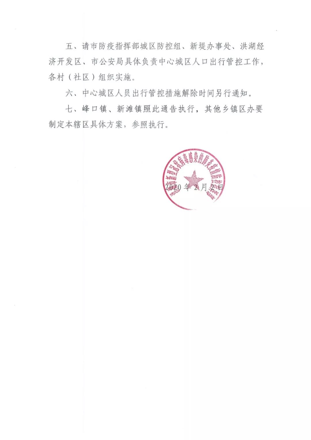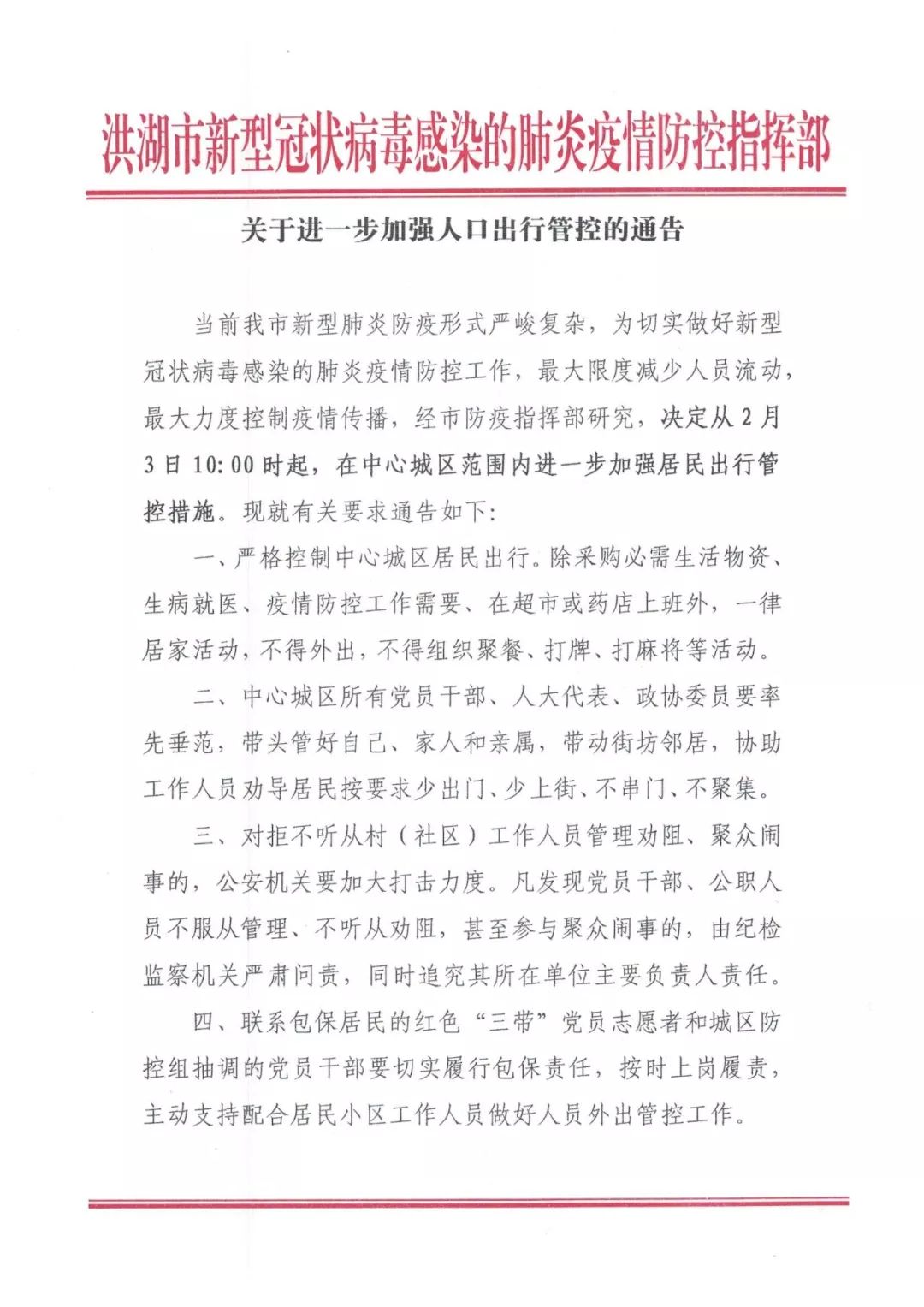 五、请市防疫指挥部城区防控组、新堤办事处、洪湖经济开发区、市公安局具体负责中心城区人口出行管控工作,各村(社区)组织实施。