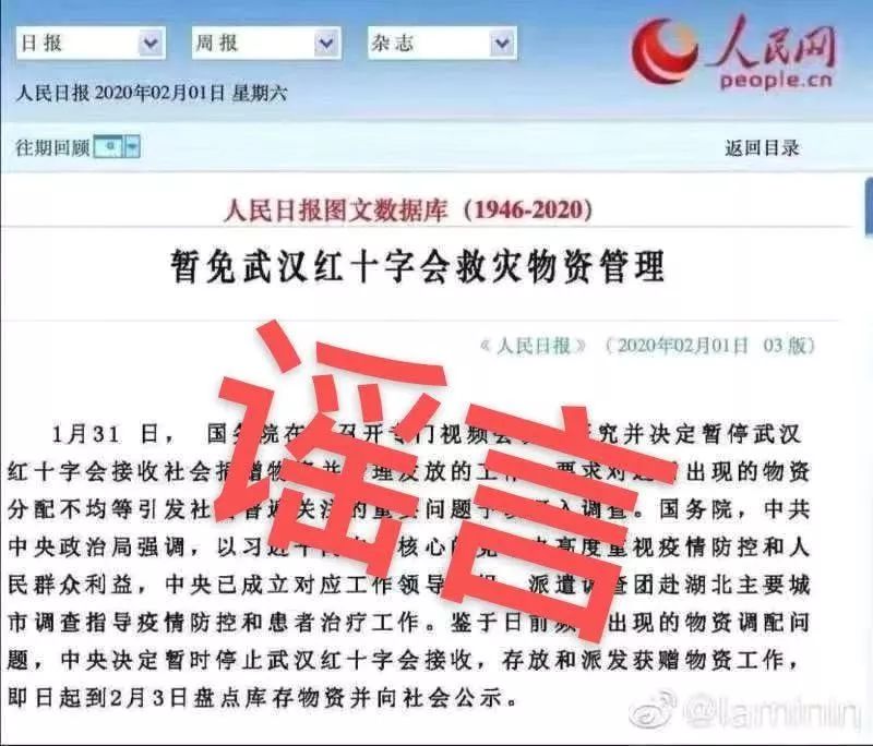 一张“人民日报报道截图”在网上流传,该截图显示:“ 1月31日,国务院在京召开专门视频会议,研究并决定暂停武汉红十字会接收社会捐赠物资并管理发放的工作……”从图片中看,这篇报道刊发于2020年2月1日人民日报第三版。