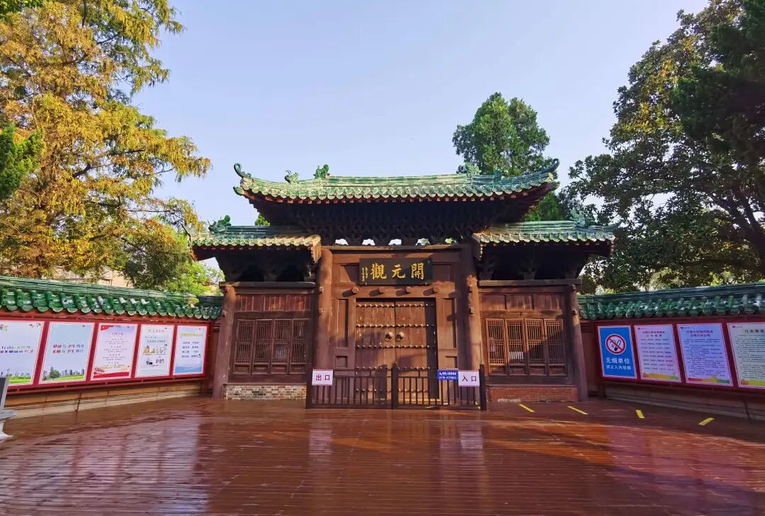 开元观位于荆州古城西门内,主体建筑由山门、雷祖殿、三清殿、祖师殿构成,是一组自成体系、保存较完整的道教建筑。开元观坐北朝南,“一门三殿”沿中轴线依次排列,占地约5000平方米。