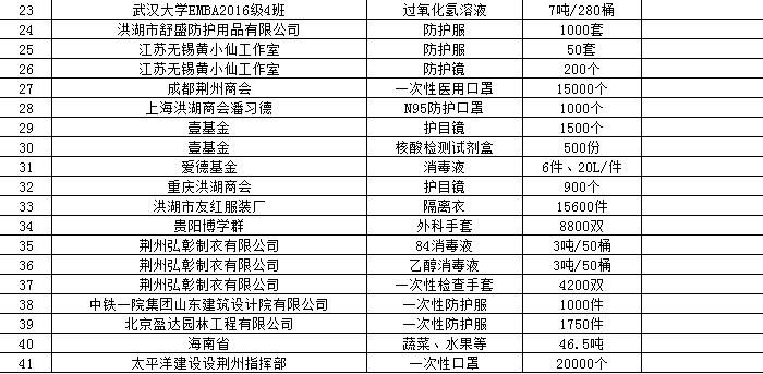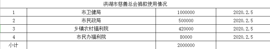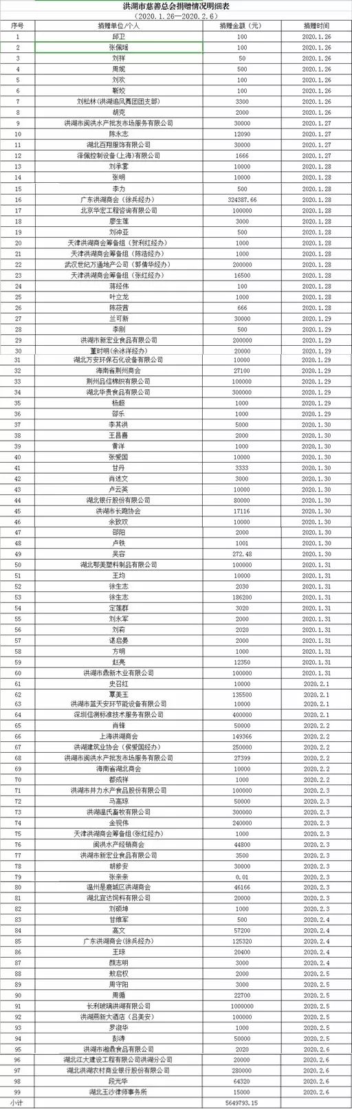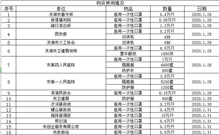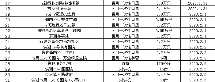 自新型冠状病毒感染的肺炎疫情发生以来,社会各界纷纷伸出援助之手,捐款捐物,为我市疫情防控工作提供了大力援助,体现了社会大爱和守望相助的精神。现将洪湖市接受捐赠及使用情况公示如下(2020.1.26—2020.2.6):
