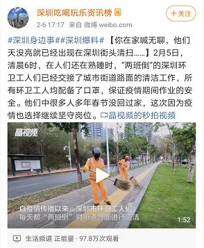 2月5日,清晨6时,在人们还在熟睡时,“两班倒”的深圳环卫工人们已经交接了城市街道路面的清洁工作,所有环卫工人均配备了口罩,保证疫情期间作业的安全。他们中很多人多年春节没回过家,这次因为疫情也选择继续坚守岗位。