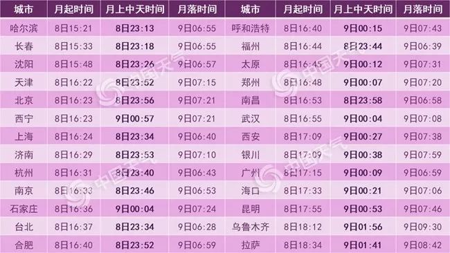 我国幅员辽阔,各地最佳赏月时间也有所不同,偏东偏北地区月起较早,往南往西地区月起时间较晚。一般来说,月上中天时,月亮高度角最大,穿过的大气层最薄,使月光最明亮,通常被认为是赏月的最佳时机。