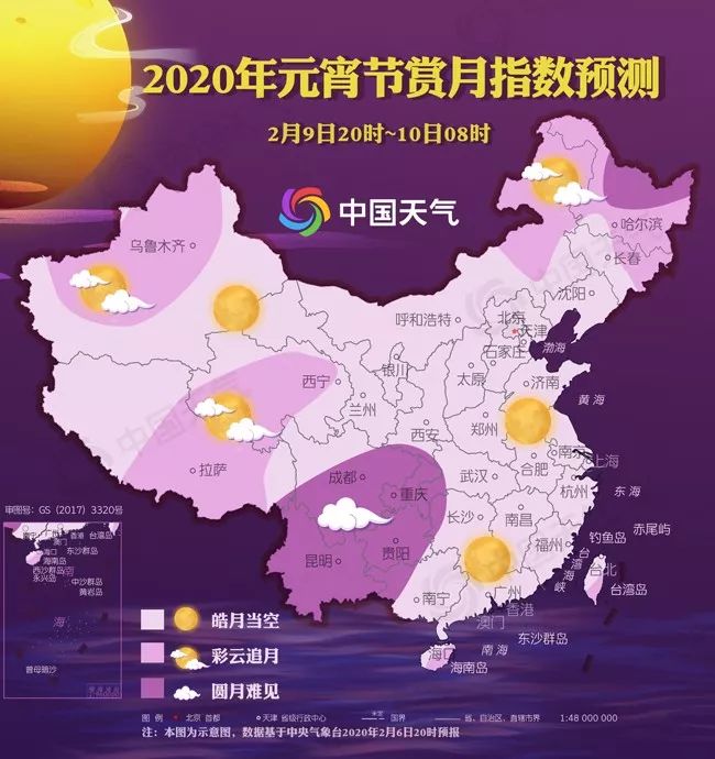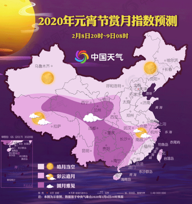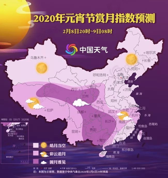根据中国天气网赏月指数预报,元宵节当天,我国内蒙古、黑龙江、吉林、辽宁、北京、天津、河北、山西、河南、山东、湖北、江苏、福建、广东等地大部天空晴朗,抬头即可见皓月当空的美景;贵州、四川、重庆、湖南、广西等地天空云量较多,部分地区有降水,将无缘观赏元宵明月;而西藏、云南、江西、安徽、浙江、上海等地的小伙伴将可欣赏彩云追月的景象。