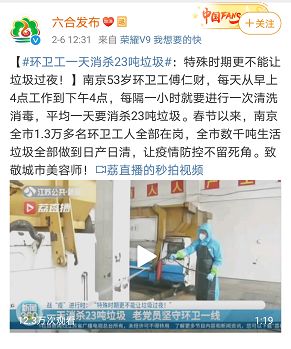 南京53岁环卫工傅仁财,每天从早上4点工作到下午4点,每隔一小时就要进行一次清洗消毒,平均一天要消杀23吨垃圾。春节以来,南京全市1.3万多名环卫工人全部在岗,全市数千吨生活垃圾全部做到日产日清,让疫情防控不留死角。致敬城市美容师!