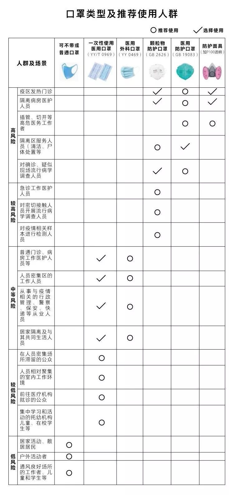 在新型冠状病毒感染的肺炎流行期间,建议选择合适的口罩类型,不过度防护。按防疫工作性质和风险等级提出以下指引: