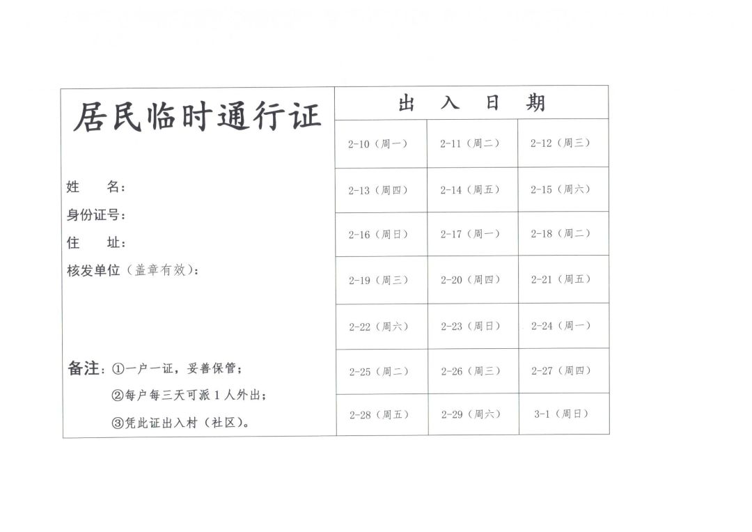 二、居民临时通行证由各村(社区)统一印制,并加盖公章;由各村(社区)负责发放,一户一证。没有必要,居民尽量不要出村(社区),确有需要的,居民凭身份证和临时通行证出入,每户每三天只可派1人外出,每次外出由村(社区)的防控检查点(门岗)负责核签划“√”;居民外出必须佩戴口罩。