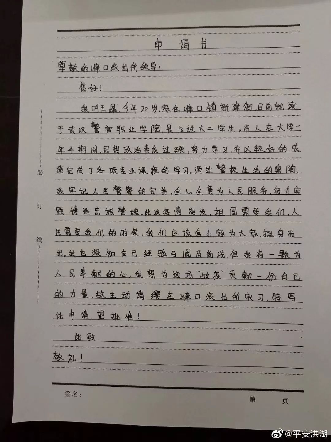“我叫王晶,今年20岁,家住峰口镇新建街,目前就读于武汉警官职业学院,是18级的大二学生……当前疫情形势严峻,恳请批准我到贵所实习参战,为打赢疫情防控阻击战贡献自己一份力量!”