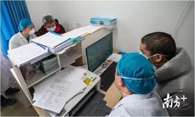 广东医疗队的队员们正与洪湖当地医护人员了解病人情况