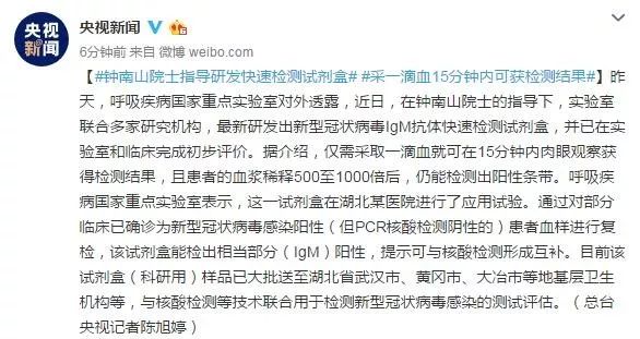 钟南山指导研发快速检测试剂盒:采一滴血15分钟内可获检测结果。