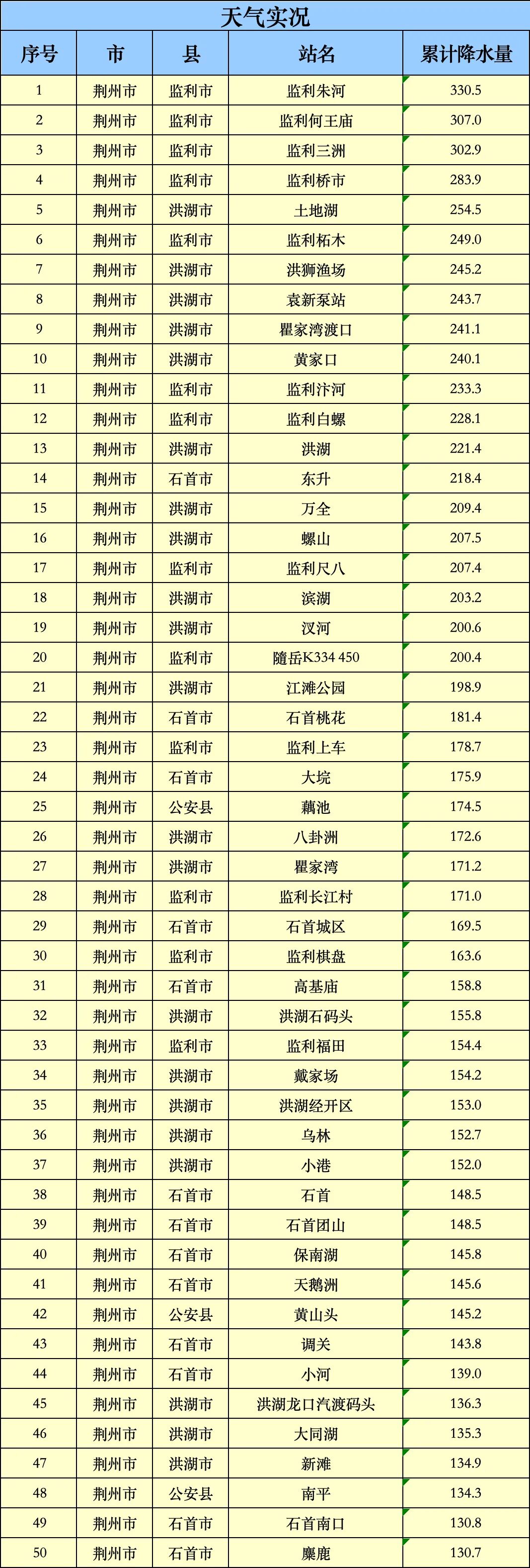 根据气象部门监测,截至22日08 时24 小时内,我市公安、江陵等地出现暴雨到大暴雨,石首、监利、洪湖发生大暴雨到特大暴雨。最大小时雨强为 108.9 毫米(监利朱河镇 21 日 20 时),降水较大的站点有:监利朱河 330.5、监利何王庙 307.2、监利三洲 303.3、洪湖土地湖 261.4、洪湖洪狮渔场 251.1、洪湖黄家口 249.5、石首东升 217.9 毫米。22日至24 日,石首、监利、洪湖仍将有暴雨到大暴雨,局地特大暴雨,且与昨日强降水位置高度重合,防汛抗灾形势严峻。