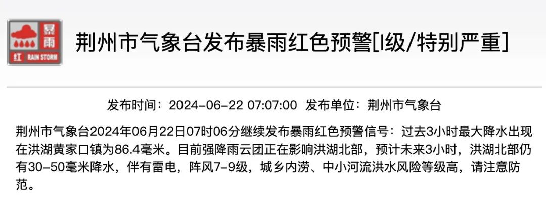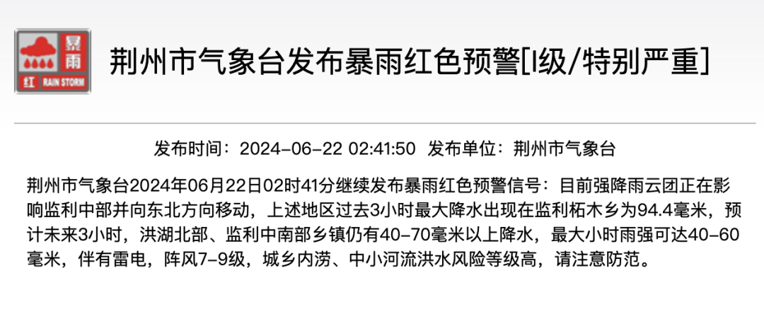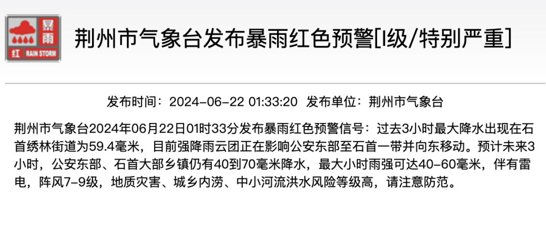 6月22日:上午降水逐渐减弱,夜间有所加强,石首南部、监利南部、洪湖大到暴雨,局地大暴雨,其余地区小到中雨、局部大雨(最大小时雨强40~60毫米)、雷暴大风(7~9级)。(重点时段:22日夜间;重点区域:石首南部、监利南部、洪湖)