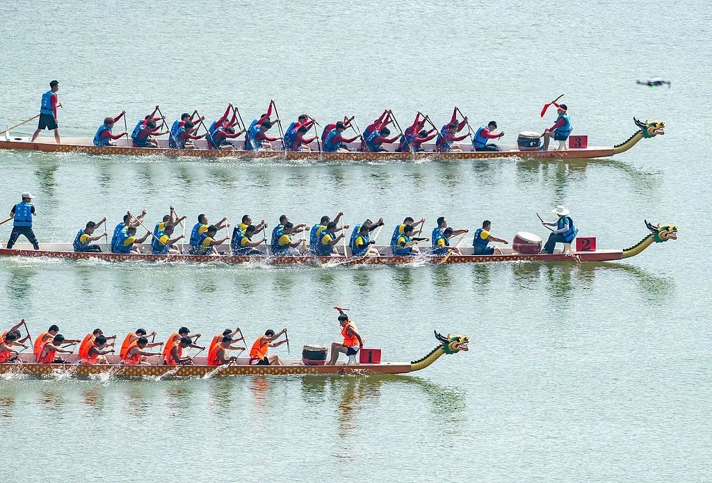 端午节,参与竞渡比赛的龙舟在三峡大坝前秭归县水域奋勇争先。