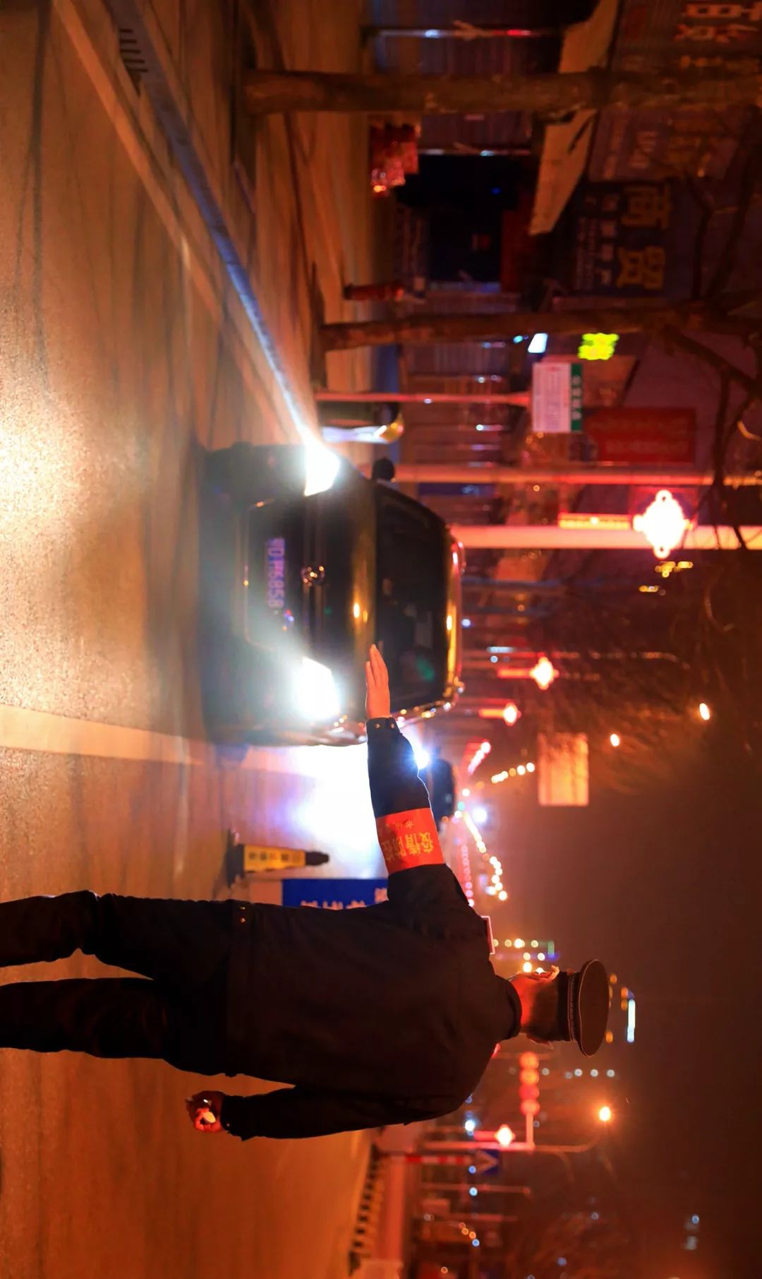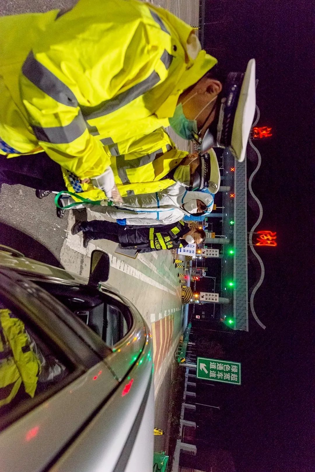 21:00 宏伟南路公安局执勤点,每个值守人员都打足了精神,对过往的车辆进行严格检查,并对驾乘人员进行体温测量。