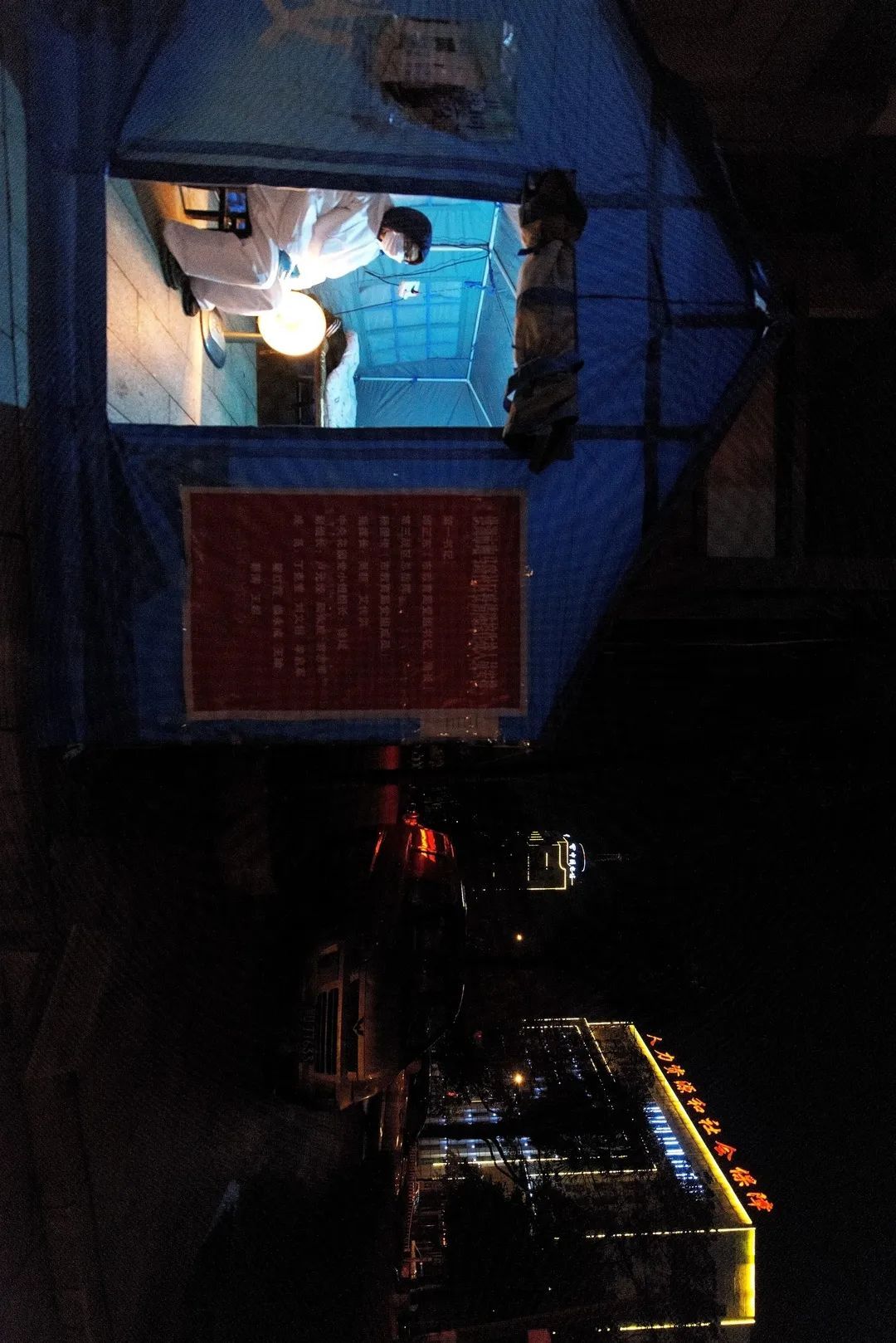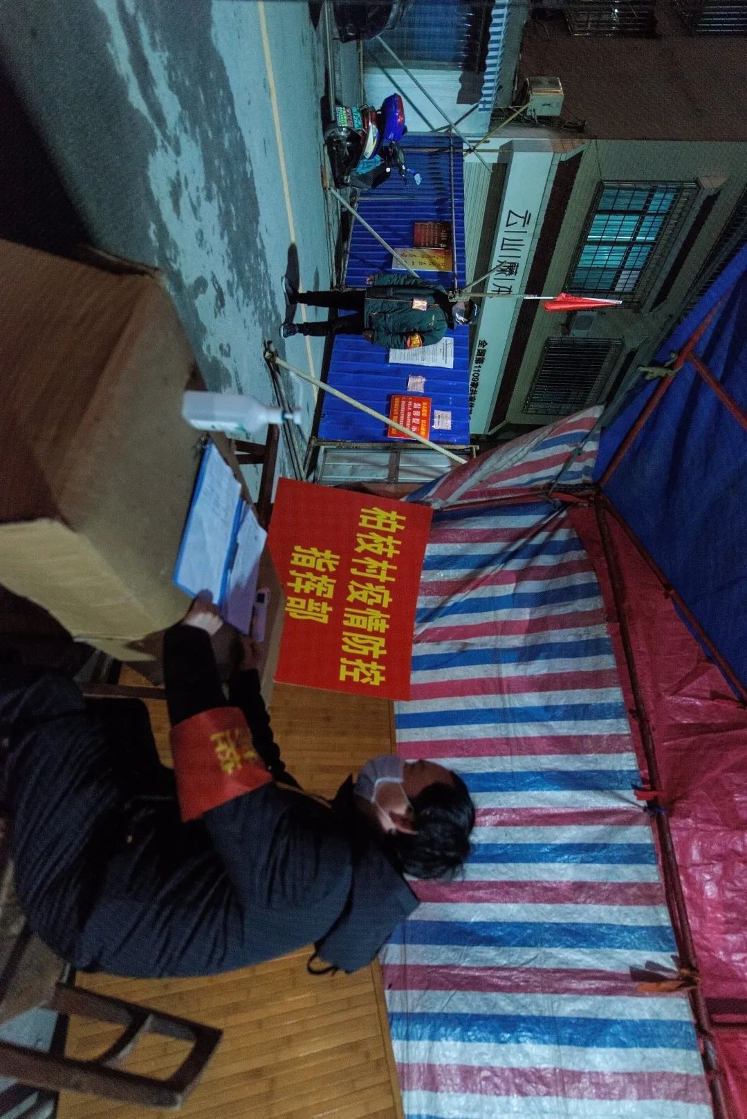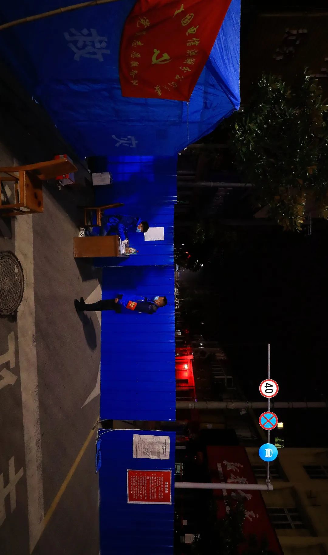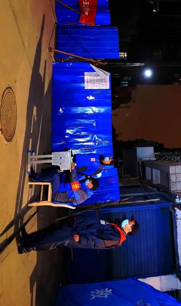 19:00 室外气温越来越低,在柏枝五巷电信公司值守点,帐篷内外的值守人员都保持着警惕,对过往人员进行登记核查。